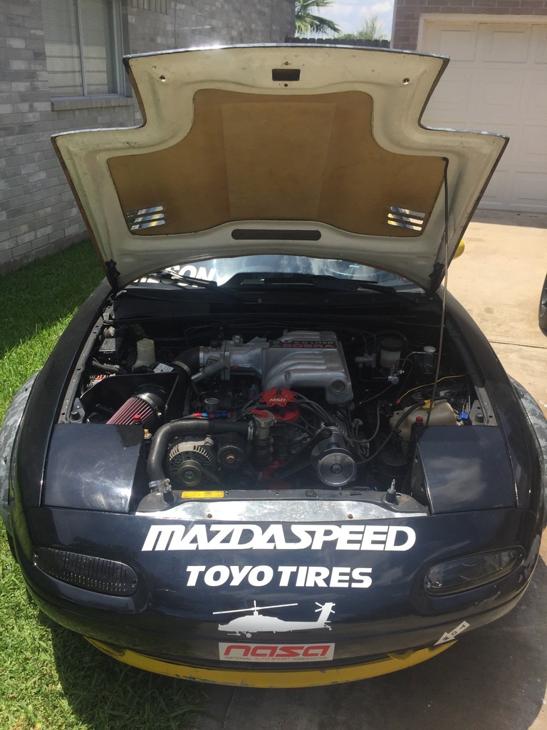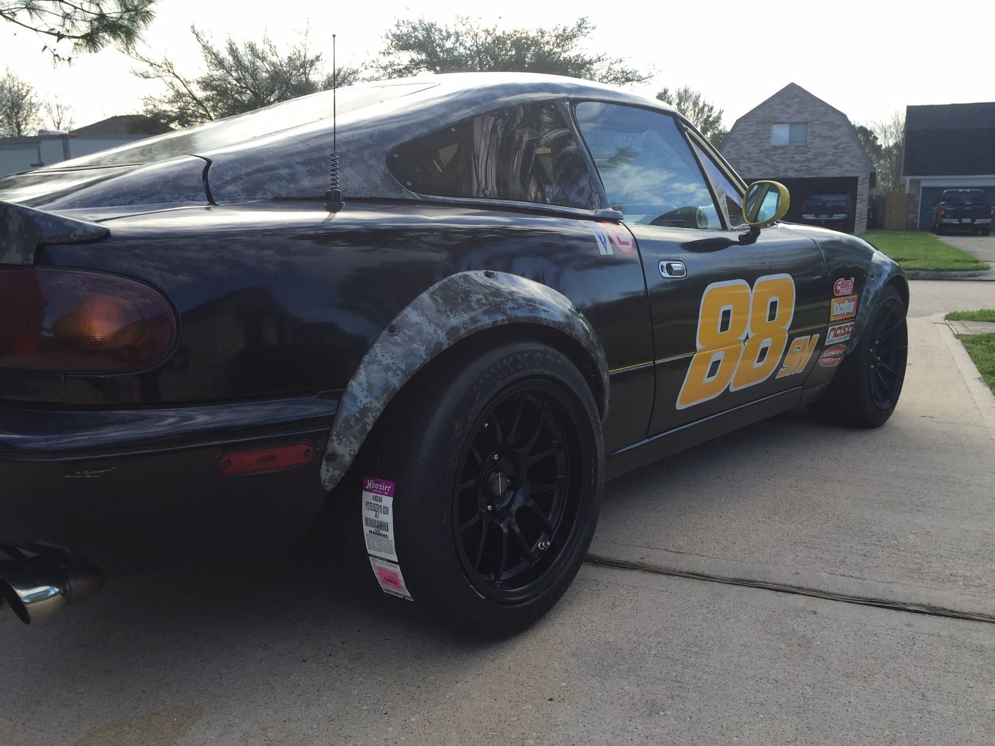 So, I sold my LS2 Miata a while back to fund the pool. Pool has been great! Before I sold it, I took it to the Texas Mile and hit 176.6MPH. I have been hooked ever since. I have been planning a 200MPH car and wanted to do a Miata, but feel an RX-7 FD will have better aero. So here we go again, gonna list my 302 Miata as pictured above up for sale to fund the RX-7 project. Since the last posting, I have added some 15x12 rims in the rear wth wide Hoosier tires and some Hoosiers in the front for better track action. Car is so much fun. The only think I have not done that I was planning was complete fuel system make over. Get rid of the small Miata lines and add a fuel cell with AN-6 lines for delivery and return.