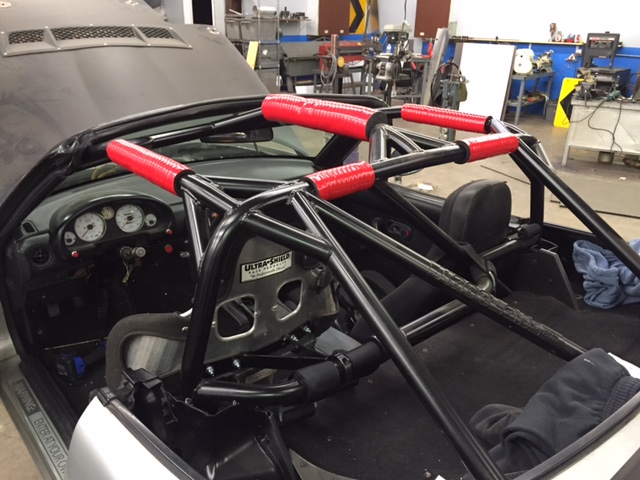 A stock soft top will not fit over the rollcage, but since the rollcage is the same as what I’ve done in dozens of SCCA Spec Miatas, a stock “gutted” hard top will fit. Once I get some free time, my plan is to have a “bikini top” made for the car. I do have the attachment header from a convertible top that can be used as the start for a bikini top build.