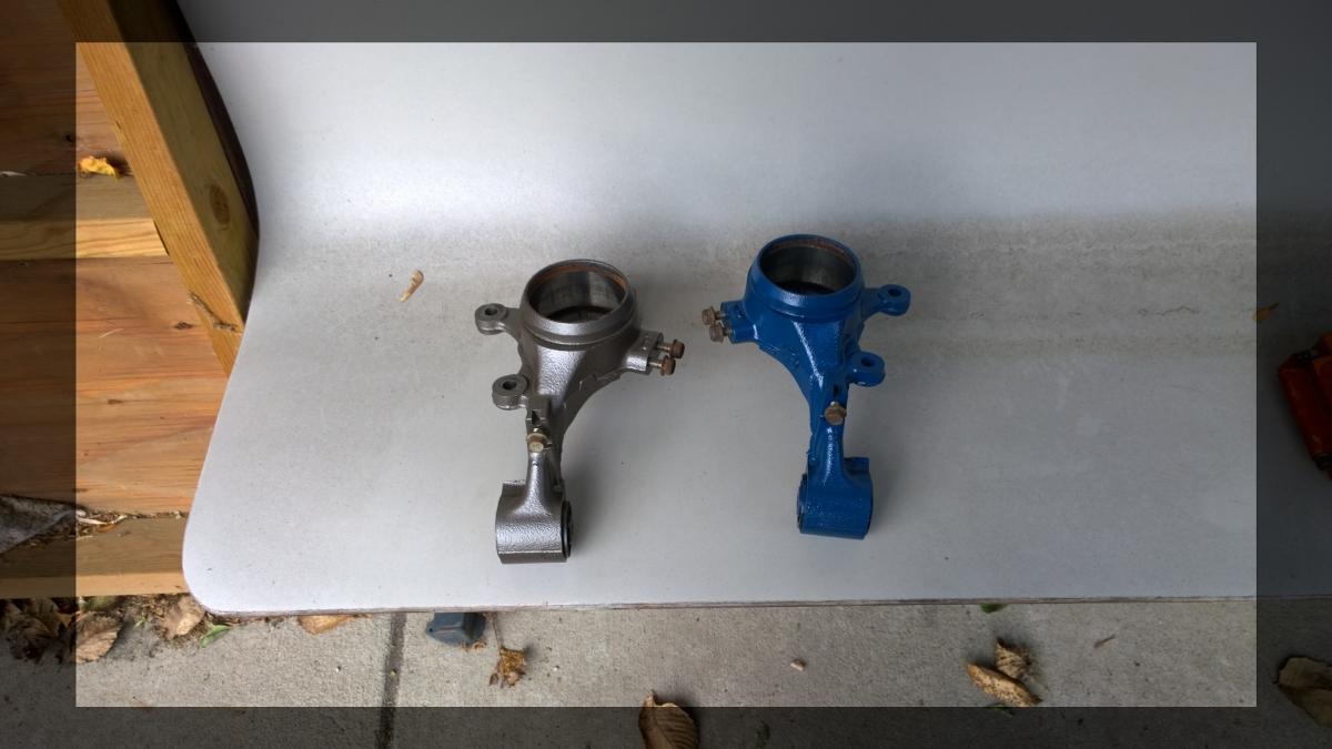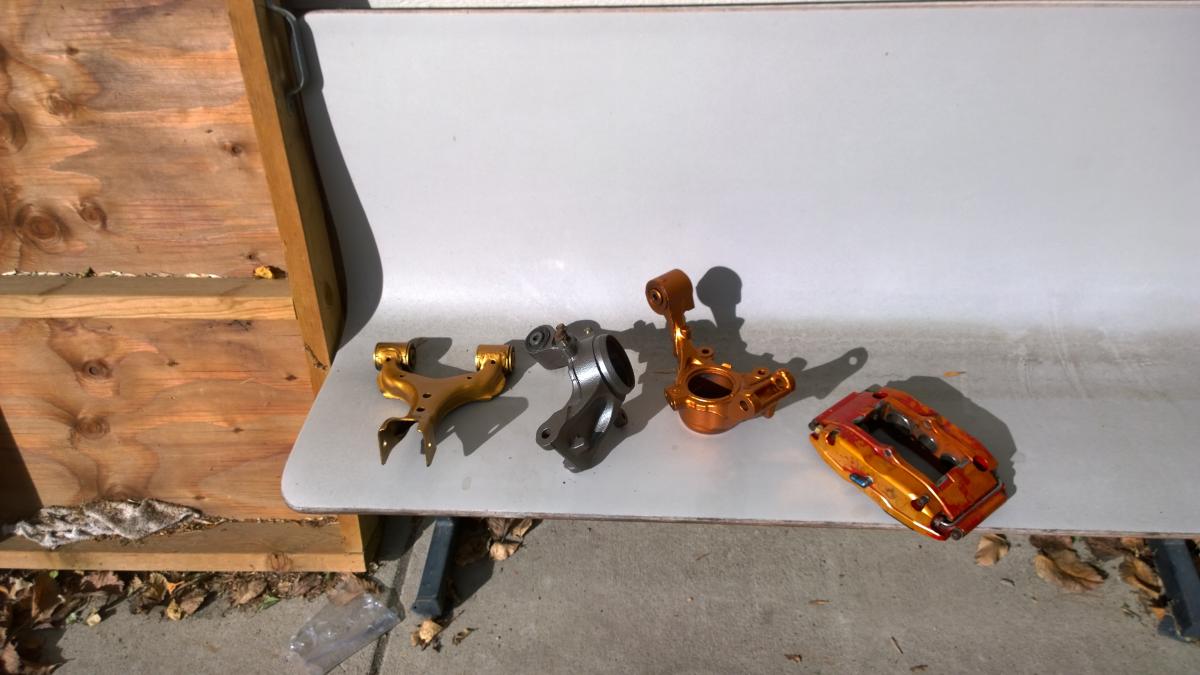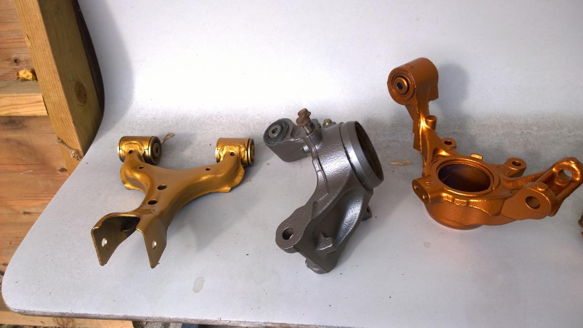 Hey guys, here's a topic: coating for your subframes/control arms/brakes/etc on your car. This may seem a bit arbitrary to some, but most of us aren't spending time and money on our swaps just to have a rusty bucket with a bunch of power. So, for me I'm looking at powder coat, anodizing, and painting some of the parts under the car before I re-install them. And that begs the question, which colors to choose? I think the V8R choice of dark gunmetal grey is a safe, conservative color that looks good on most cars. However, here are a few shots of what I've been thinking of. I wanted green to look good, I really did, but decided against it after a 4" square tester.