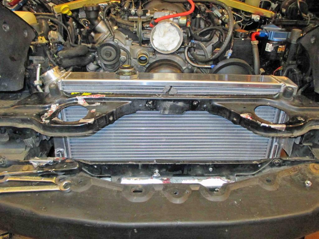 However all that being said having been down this road too many times now if I was building a Ford I would run the same radiator I am running now to get the duel pass feature and just use a long hose. Lots of cars do just that from the factory and it's no big deal. http://www.summitracing.com/parts/gr...9-ls/overview/ You bend those side flaps forwards, trim them a bit for the bumper brace and it fits like an *** on a pot in the car. It's probably the biggest radiator you can really get in the car and the duel pass is well worth the $$.