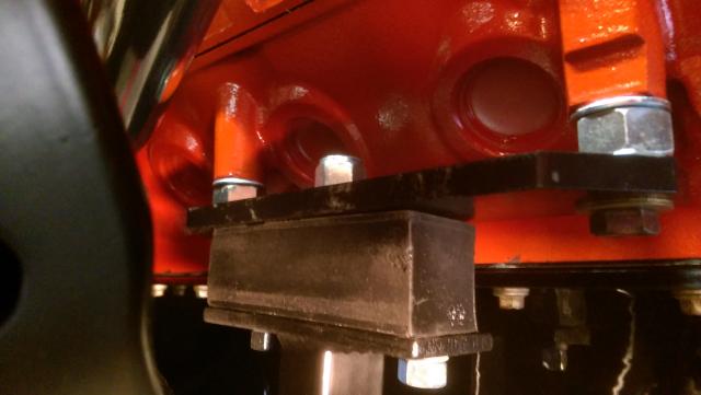 As you can see in the picture, the engine is compressing the rear of the motor mount and lifting in the front. I have the top nut a little loose. Does anyone know if this is typical? I guess I'm OK with making high/low spacers for the engine block mounts and this actually helps with steering rack clearance - I can shorten the spacers a bit with the engine tilted as it brings up the oil pan in the front area clearing the steering rack more. I have seen other posts where the washer stacks have more in front than in back so it may be a normal setup. Otherwise, the trans will have to be lifted much more than cross member and trans mount currently set it at.