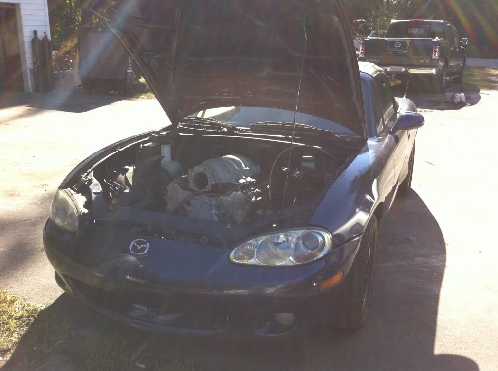 not much but ill take more soon (my c5's drive shaft took a dump on me last week so ive been working on that) Attachment 8089 Attachment 8090 Attachment 8091 the steering shaft needs to be modified still, i could send it in however i have plenty of material and a tig welder to do so... so no worries Attachment 8092 and there it is prior... here are the specs LS2 VRX 6 Cam Fast 90 intake Proshifted T56 (straight cut gears) Stock Miata LS rear end with a torsen and 3.91 gears i may swap the rear end eventually for the 8.8 that i actually have on hand along with the boss frog frame, but i want to see how the stocker does first |