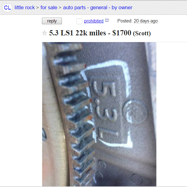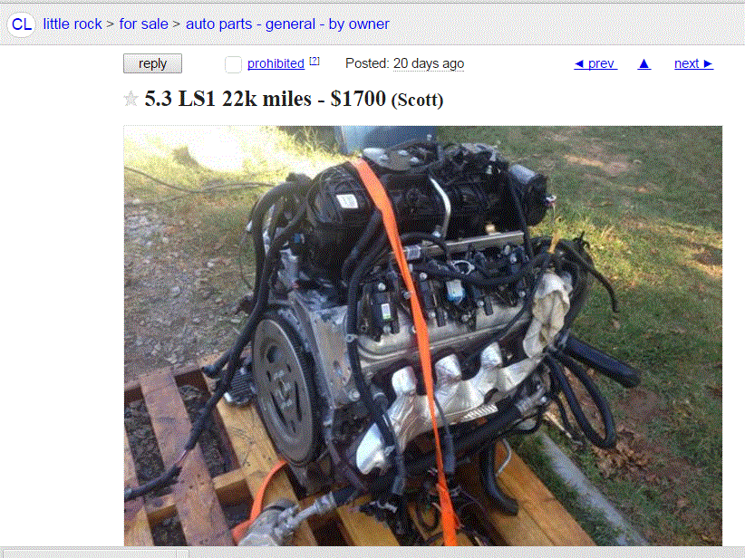 Ad lists 5.3 LS1 with 243 heads all aluminum with wiring harness and computer and mass airflow out of a wrecked 2013 Silverado Z71 with 22k Miles for $1700 Seems cheap, but what do I know.