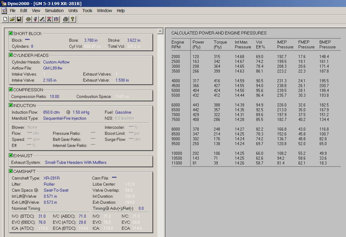 I mentioned earlier in this thread using dyno simulation software to predict the characteristics of a motor with a particular cam and combo. For grins and giggles I've attached the Dyno2000 simulation for your engine with this cam.