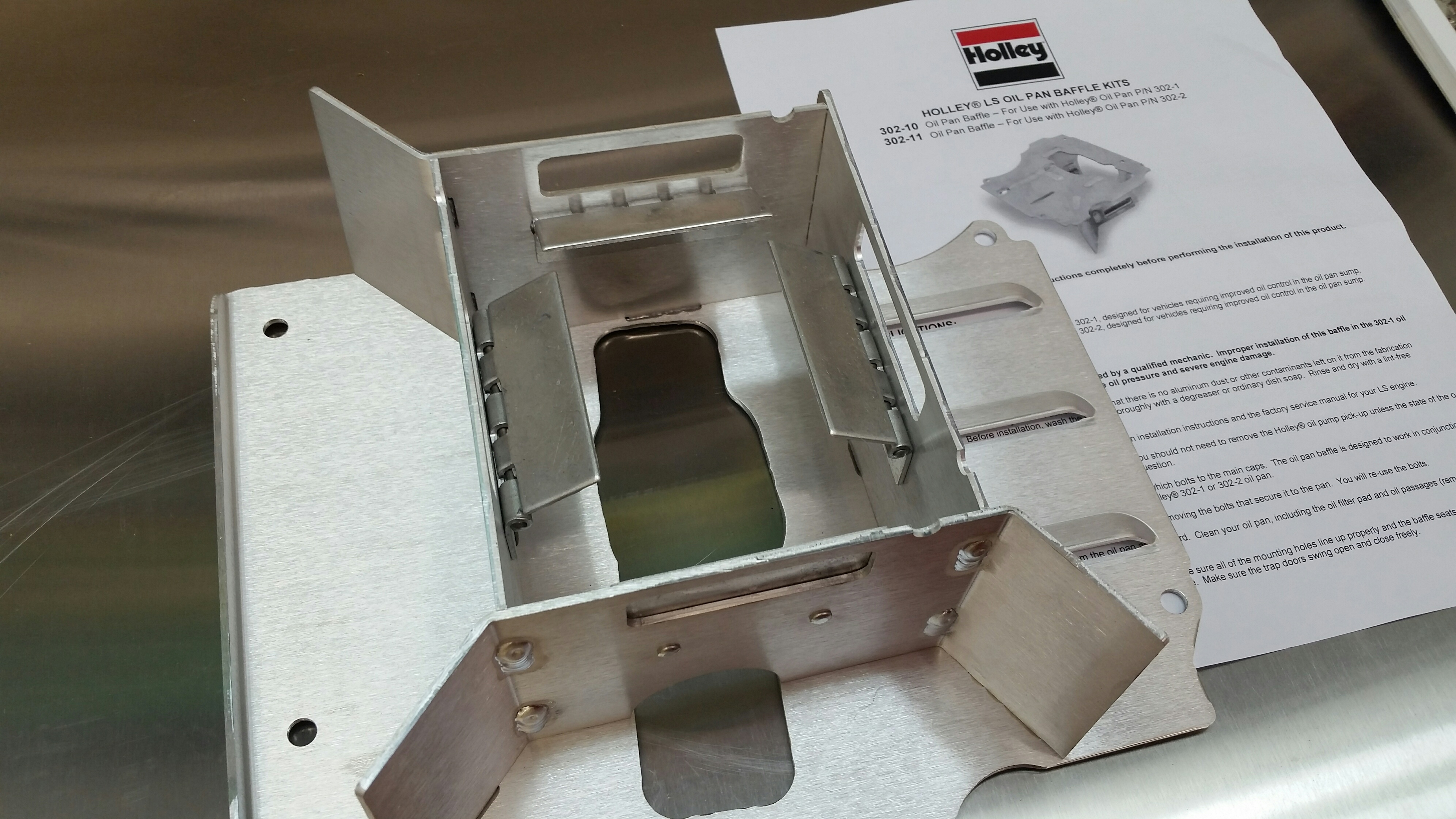 The baffle that comes with the pan is nothing more than a plate and I wasn't going to risk losing oil pressure on my new engine. I found out that Holley offers an aluminum race baffle complete with trap doors specifically designed for the 302-2. It is a beautiful piece. Here's the catch....It's an extra $200.