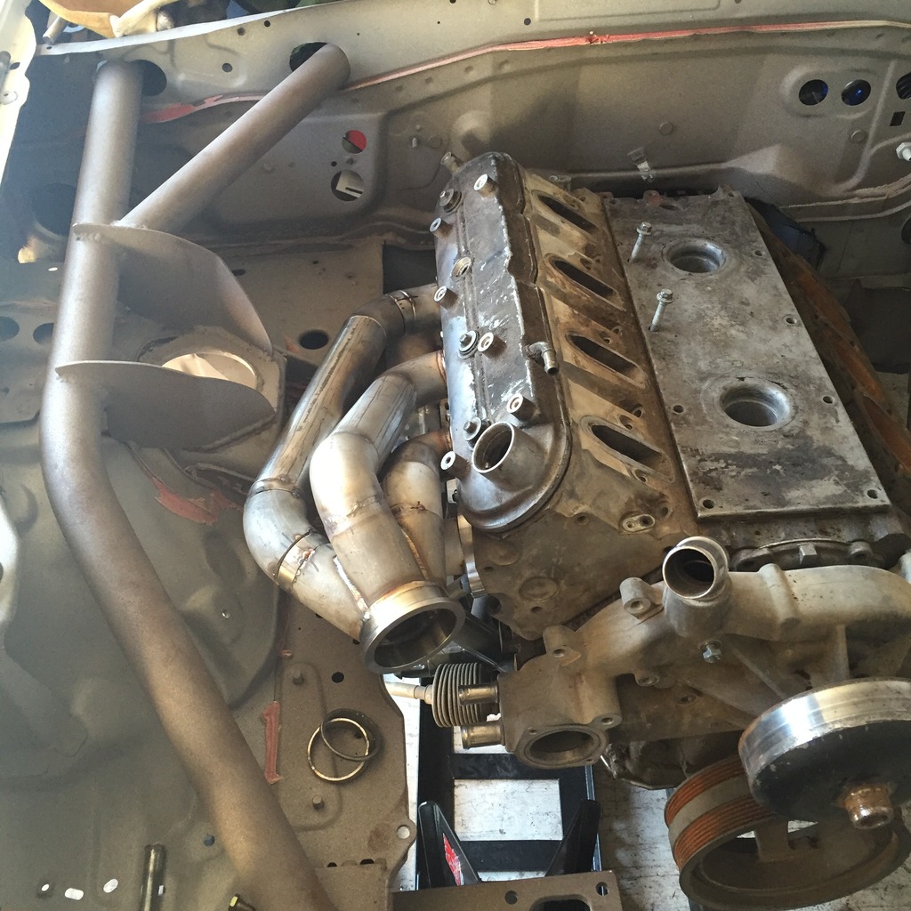 Small update, I redid the passenger side header. I tried building it when I didn't have the transmission in the car. So once I got the engine and transmission in their respective places, the header didn't fit so well. So I went ahead and started building another one last night. I moved the collector back and started on the merge pipe.*