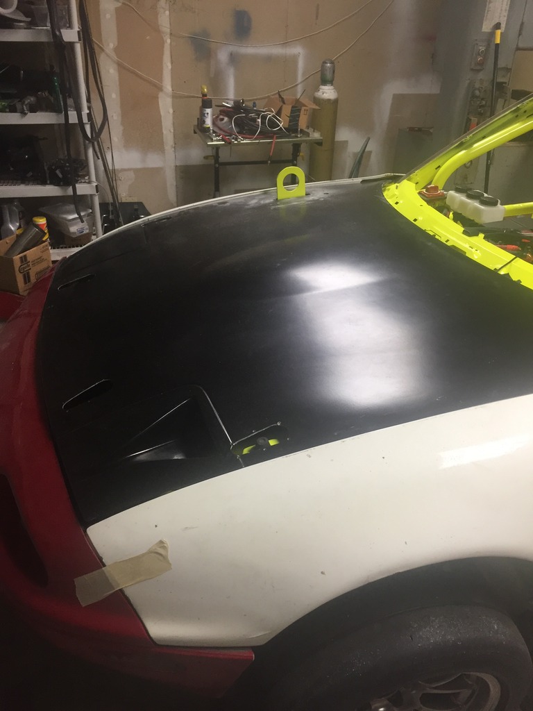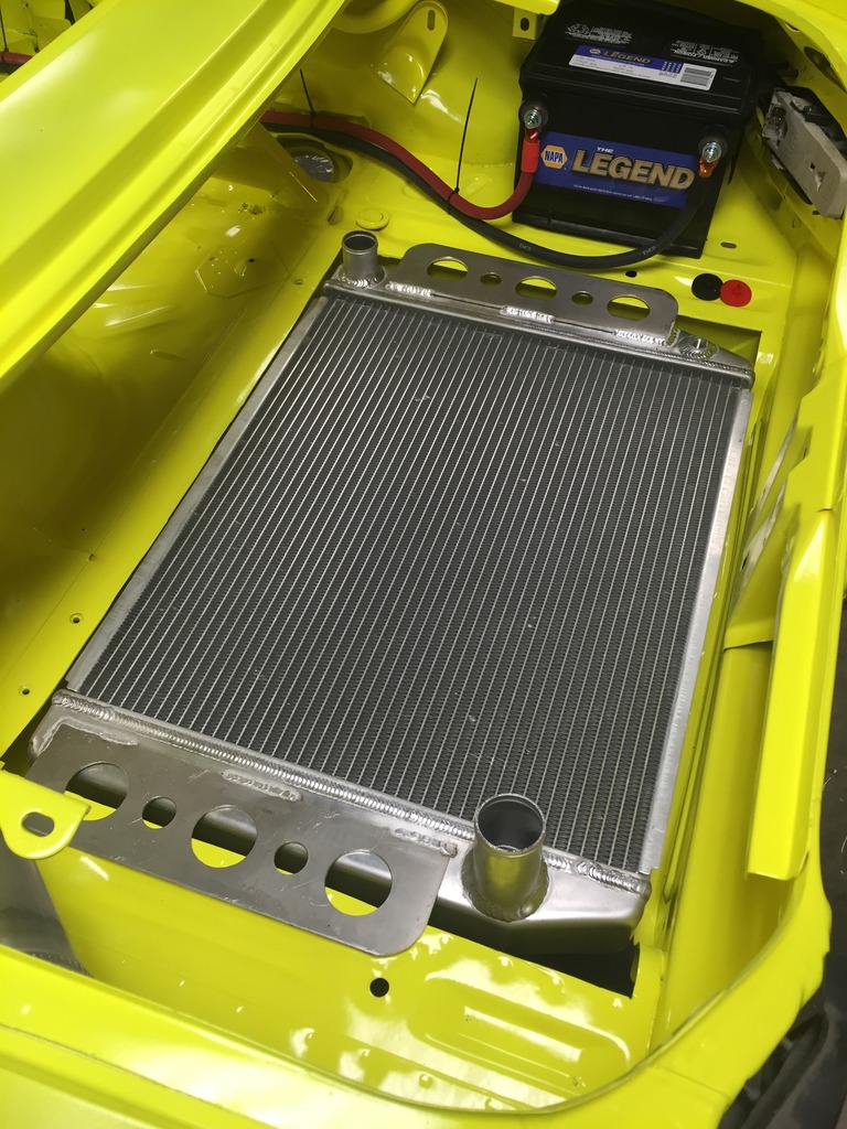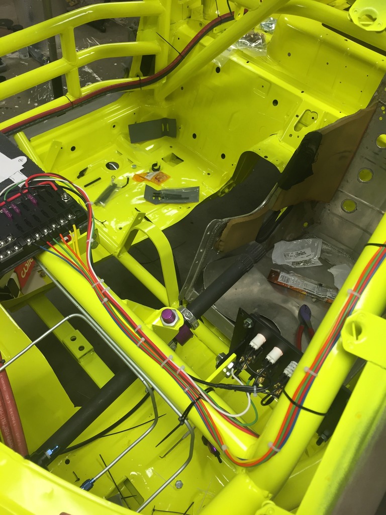 Pictures are in no particular order. I decided to ditch the idea of using a flashed ECU and modified harness. I went ahead and went with a Holley unit, with its own engine harness. The car is wired for the most part, I need to order a few more things to finish that up. Still waiting to buy the clutch, bellhousing, and hydraulic throw out bearing conversion. Things have been going somewhat well with getting the car put back together. Two of the things that still have me stumped are the downpipe construction/exhaust routing and how to duct the radiator. My original thought was from the top and out the bottom, but after talking to several people I am starting to lean more towards pulling are from the bottom of the car and ducting the hot air out from the finish panel area. That may take a couple of attempts to get the right set up as far as that is concerned. The exhaust will be tackled once I get the clutch and **** that way I won't have to take the engine and trans back out when it shows up.*