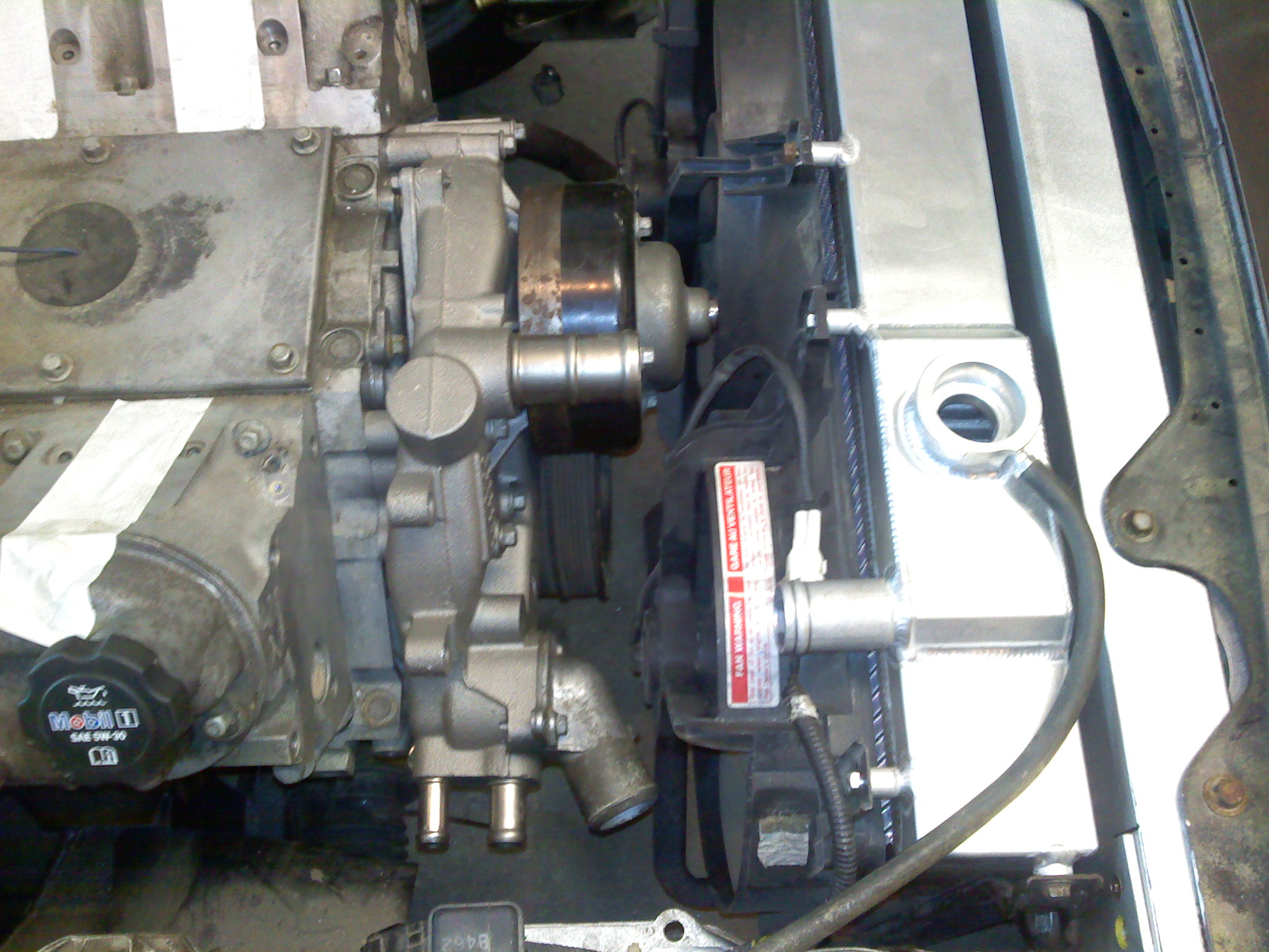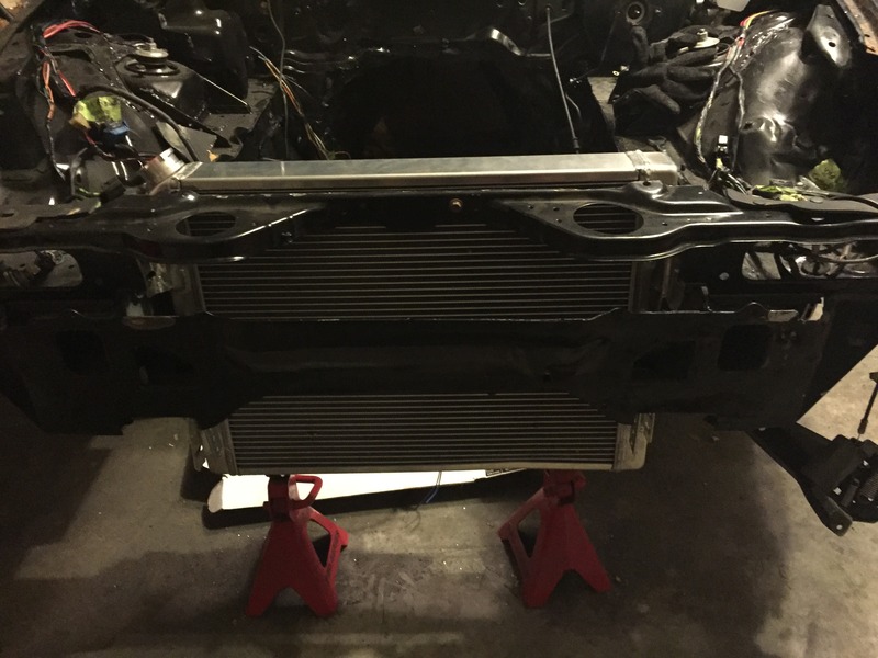 Got the radiator 99% mounted. I want to leave a little adjustment for when the hood/AC/motor/sway bar are all there.