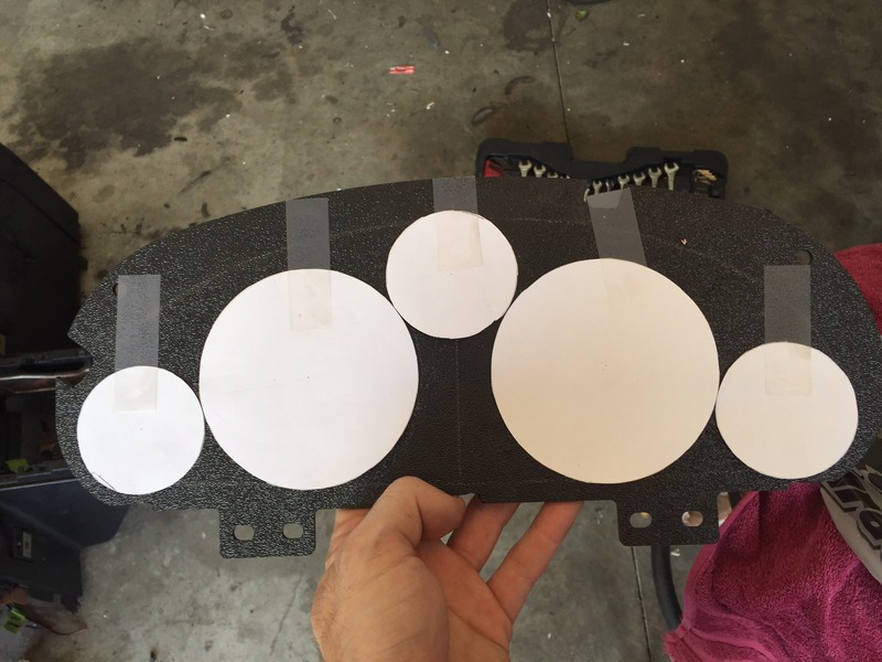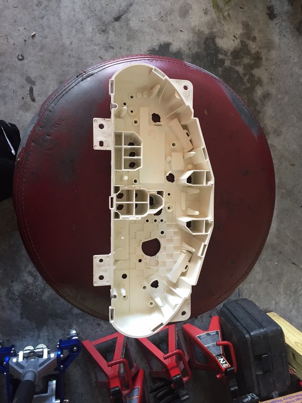 Hacked up the back of both the "white" backing piece and the black cluster surround with my Dremel and mounted the gauge backing plate: