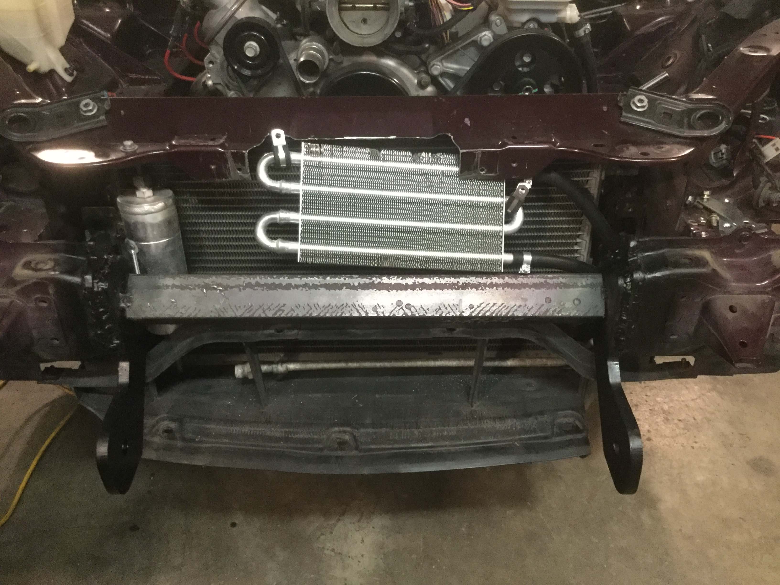 The air conditioning radiator and power steering radiator are roughly installed where they will be located but neither have brackets attached so that they can be moved as needed when the actual radiator and cold air intake gets installed, hopefully this weekend. I needed the power steering radiator to be connected so that I could start the car. Didn't want to run the risk of starting the car with no fluid in the power steering pump. You can also see the tow brackets and bumper angle support that still need final welding in place after checking fitment of other front end stuff. As somebody else mentioned on another build thread, Summit Racing and JEGS both have house brand small radiators that work real well for power steering radiators. I think the one I got was less than $30 with the necessary high pressure hose and clamps.