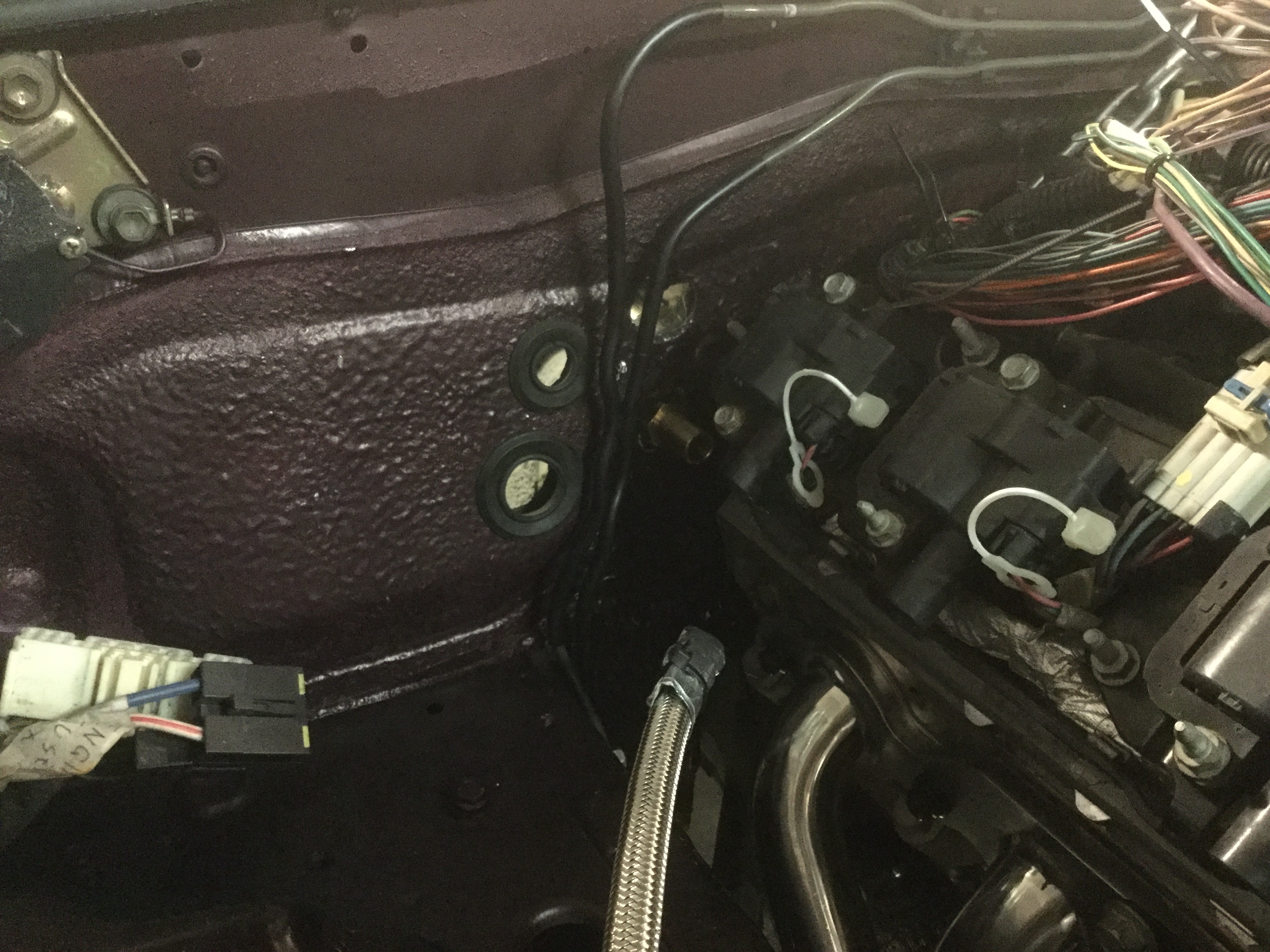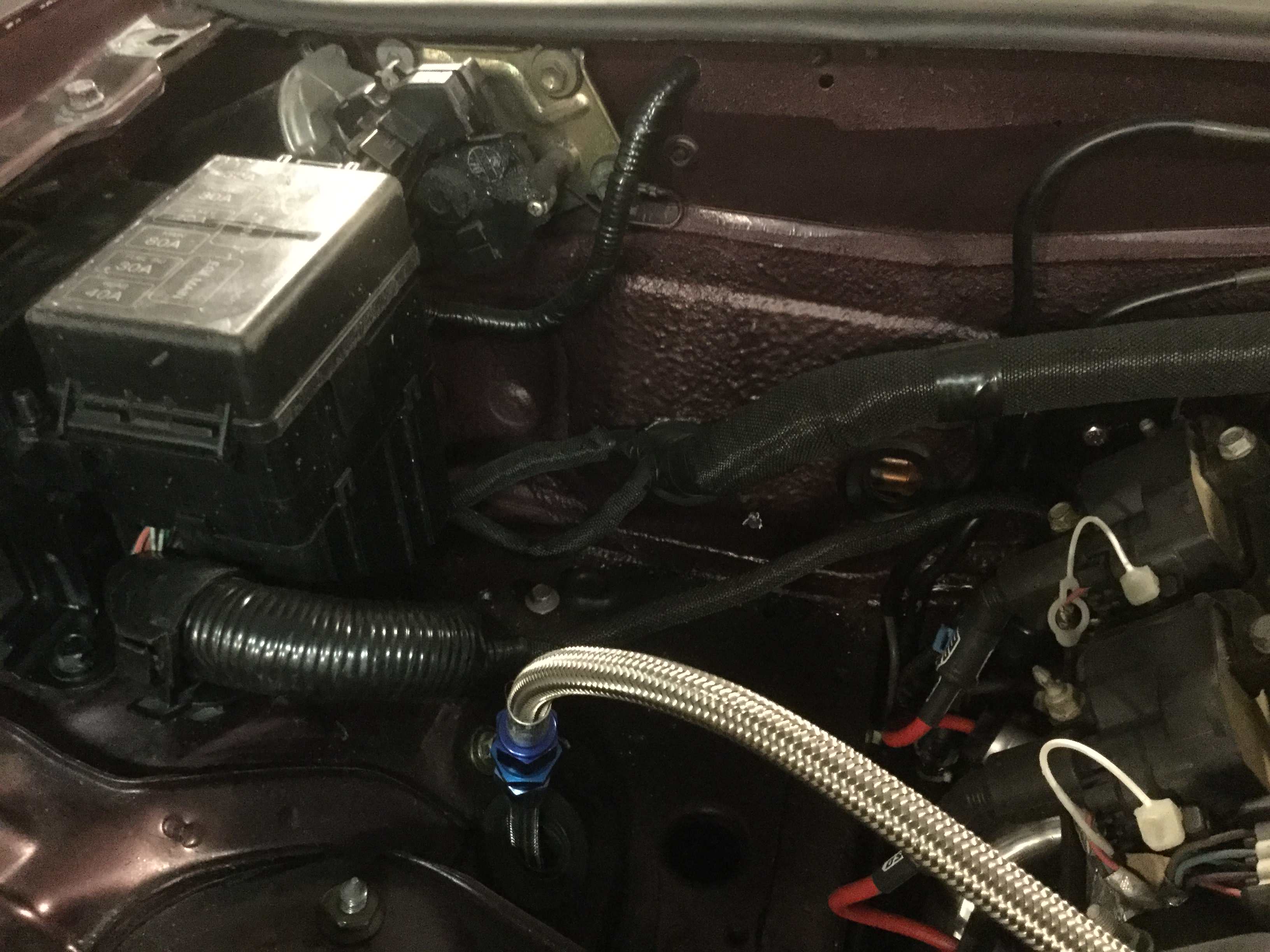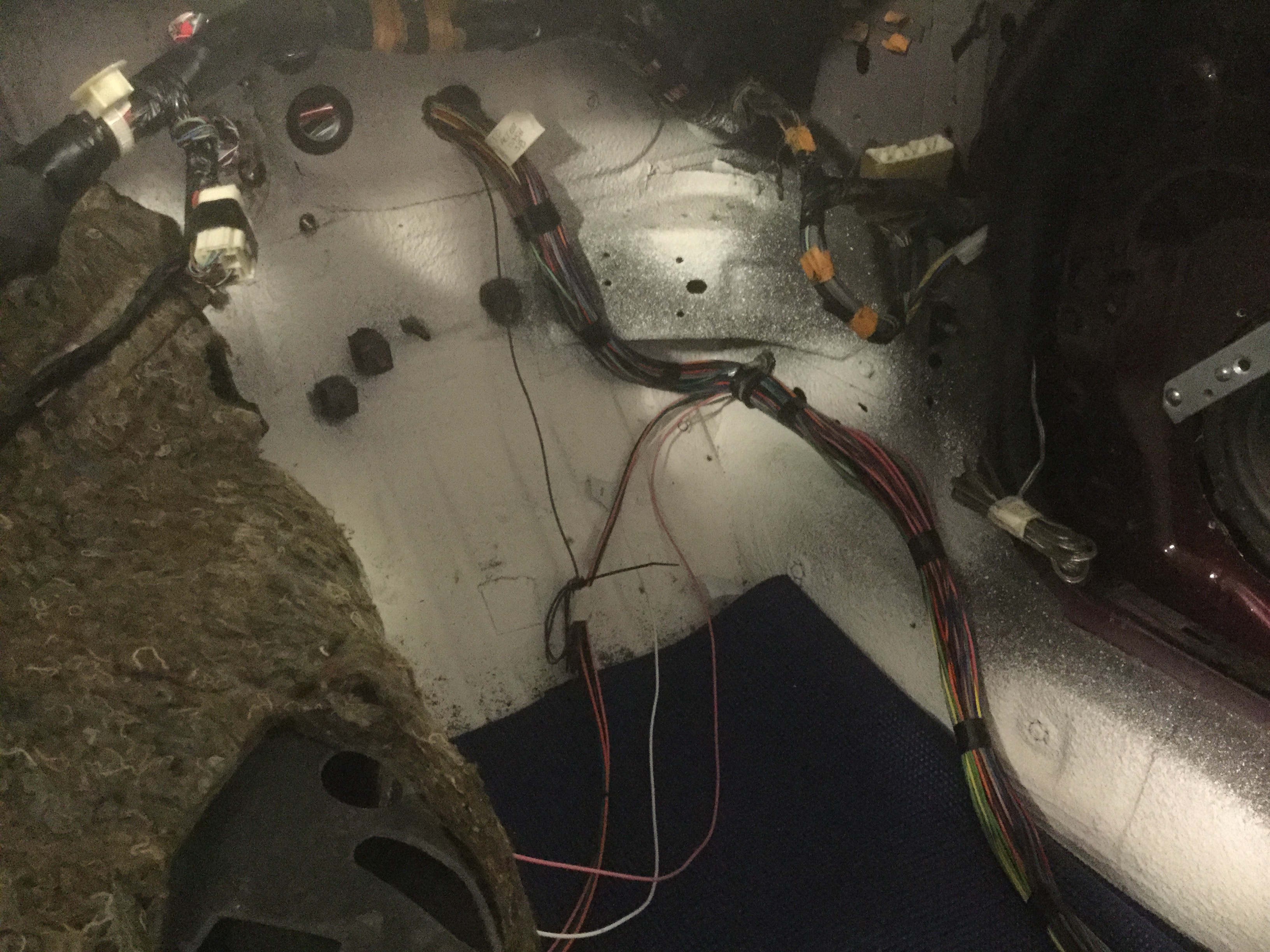 This is a view where I put the main harness thru the firewall and into the passenger compartment where the ECU is located. You can see a short piece of factory plastic sleeve on the left and the newer weave stuff on the right. I ran short of the new stuff and so had to run this one piece of old stuff next to the fuse box. Attachment 8501 |