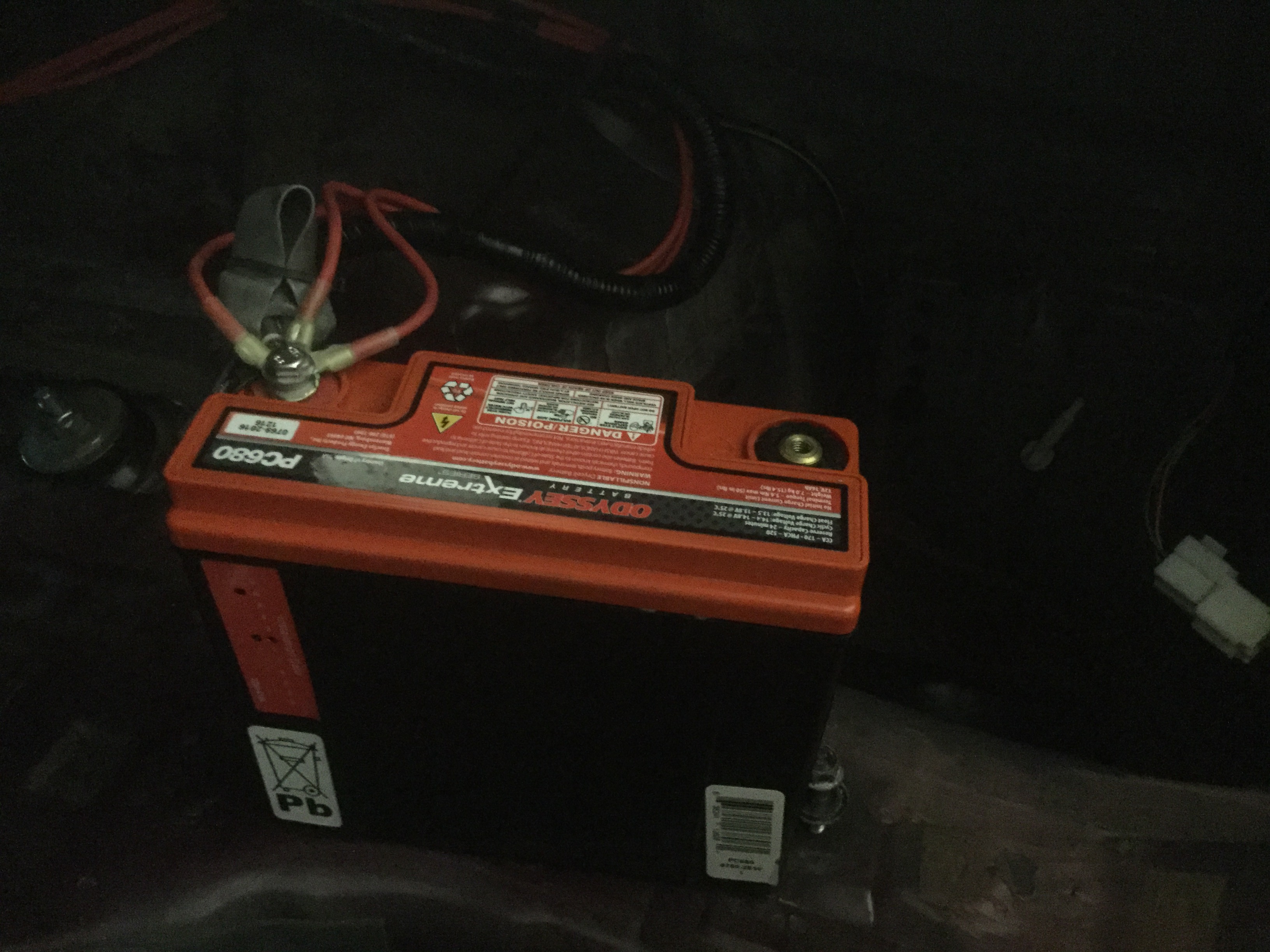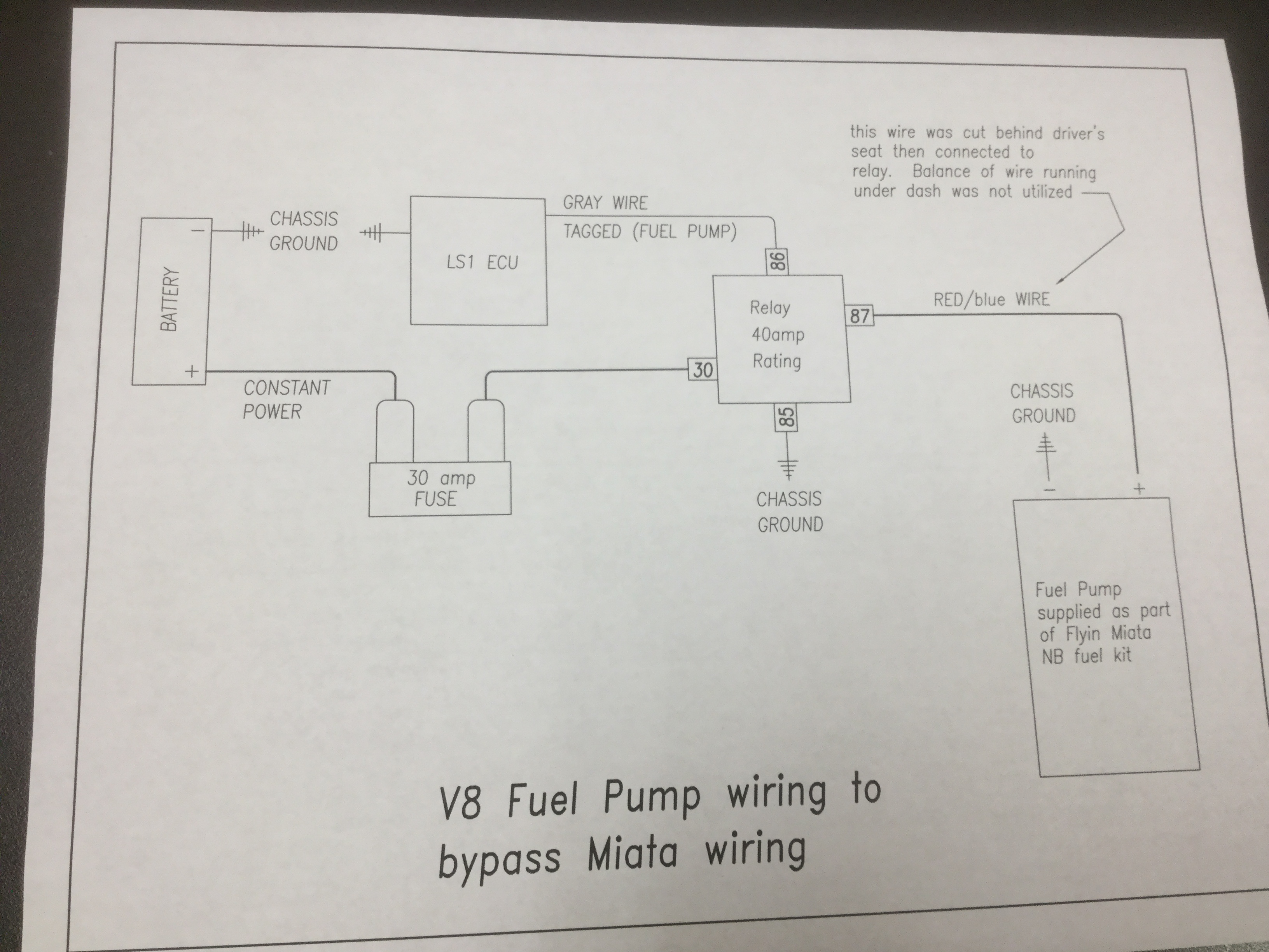 Bought an Odyssey battery. It is rated for a C7 Corvette but about the size of a motorcycle battery and can be turned any direction without worrying about leakage. The plus and minus connections are just 6mm bolts (10mm heads). Connecting it works out real well with the factory Miata cables. Just trim off the circular post clamp portion and it leaves you a flat piece of metal with the correct hole. There are several secondary connections to the plus side of the battery. The main cable connection, two red wires that go to the Painless Wiring fuse box and one red wire that goes to my home made fuel pump circuit. After taking this picture I combined the three red accessory hot wires into a single end so there are only two connections to the plus side of the battery. The factory Miata rubber cover was big enough that it could be slid over both the wires so the completed piece looks clean and neat. Edit after the fact; The multitude of wires connecting individually to the positive bolt just looks home made and trashy so I cut the ends on all three and combined them all together into one bundle with a single end connector and a nice piece of shrink wrap over the bundle to make it look nice and professional. Attachment 8512 Here is a picture of the wired connection that I scabbed together for the fuel pump power. It seems to work outstandingly well. It has an inline 30 amp fuse, a 40 amp relay and then connects to about a foot of the Miata fuel pump wire. For the light gauge portion of the relay circuit I connected the gray wire from the ECU to one side of the relay and then ran a ground wire to the other side. You can see where I grounded the wire to the fuel tank cover on the far left side of the picture. When I turn the ignition key to the first position the pump is noisy for about one second but then is nice and quiet. My hope is that it stays nice and quiet while I am driving. Also made a sketch to show a diagram of how the wiring was done. Attachment 8513 Attachment 8514 Edit: After figuring out that the fuse location is not accessible once the steel cover piece and carpeting is installed I moved the fuse location to be as close to the battery as possible. It works out well as there is just a cosmetic covering in the trunk so access to the battery area is nice and simple. Next thing I have been working on is identifying the instrument cluster wires that will need to be spliced into. The Flyin Miata instructions appear to be accurate for my year. Attachment 8515 The engine is just about ready for it's maiden start up. All the fluids are in and hopefully all the proper connections have been made. At some point in the next couple of days I will give it a test start before dropping the engine and front subframe out of the car one last time to finish up the wiring harness and fuel and brake line routing and covers. Attachment 8516 It is tough to tell from the pictures but I am real happy with the amount of space between the frame rails and the headers. The passenger side is tighter than the driver's side but both have enough space to work. Driver's side Attachment 8517 Passenger side Attachment 8518 |