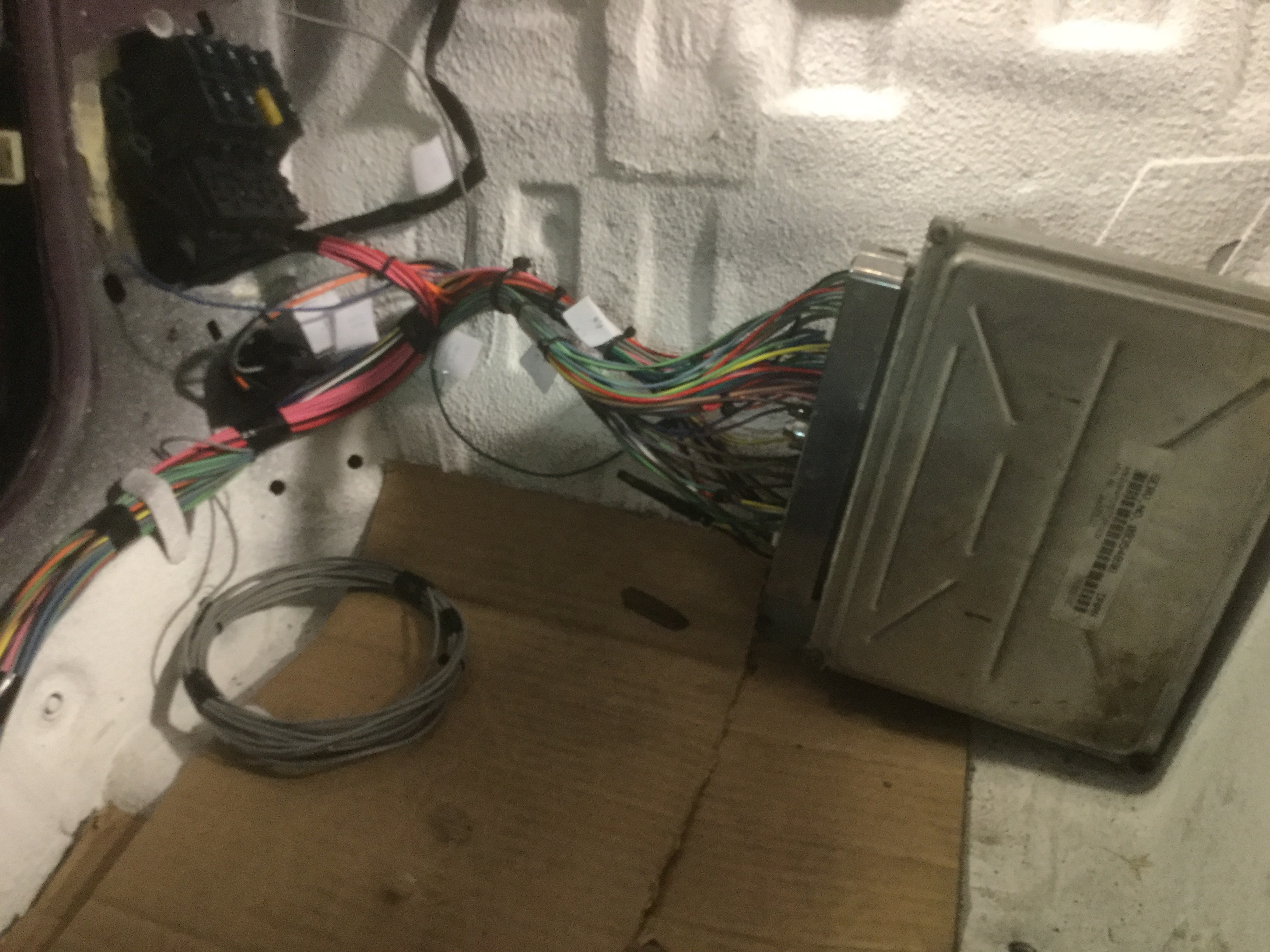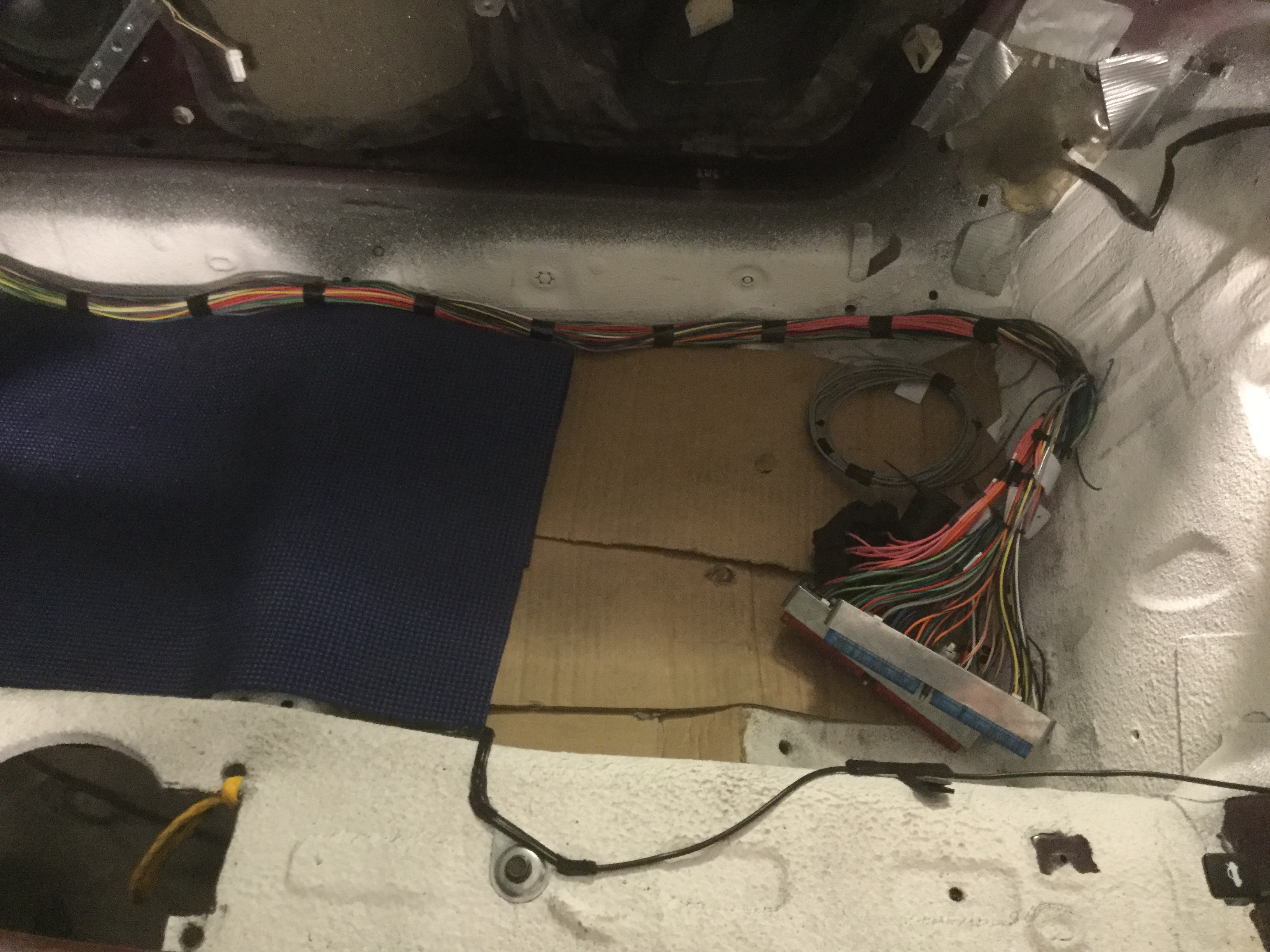 If you are talking about the area underneath the shelf that has a removable steel cover, the available area is too small for the ECU There is, however, enough wire in the harness to fit behind the seat but not enough to go all the way into the trunk. Attachment 8519 Sitting behind the passenger seat against the rear panel looks like the best placement as long as the seat movement will allow for it to go there. Attachment 8520 From the second picture you can see there is a cutout in the body panel to allow access to a door closure wire. The cutout looks to be a good size for the fuse box but will require cutting the plastic interior piece that covers that opening. Edit: After installing the interior I finished up the cosmetic portion of locating the wiring harness fuse module and ECU. The opening in the chassis just behind the passenger door is hidden by a plastic interior piece and worked very well to contain the fuse module. I marked and trimmed the plastic piece and test fit it several times before the fit was just right. The wiring between the ECU and fuse module is pretty short so the ECU has to mount next to the fuses, which tied down the ECU final location to the location it is installed at. After making a couple of aluminum brackets and slicing two openings in the carpet behind the passenger seat it all got installed. The bulky bundles of wires makes the carpeting bulge a bit but all in all it worked out pretty well. Keep in mind that it will all be hidden behind the passenger seat back after the seat gets installed. The depth of the ECU is about 3" which cuts into the amount of rear movement of the passenger seat. Not a problem for me but could be an issue for a passenger taller than 6'. https://cimg6.ibsrv.net/gimg/www.v8m...8b58c11c95.png This picture shows the location of the hole in the firewall and the routing of the wire bundle. As you can see, if I need a few more inches for some reason I could get it by running the wire bundle straight along the floor rather than snaking it around the edge. All in all I think I will be real happy with how it will clean up the engine compartment. Attachment 8521 |