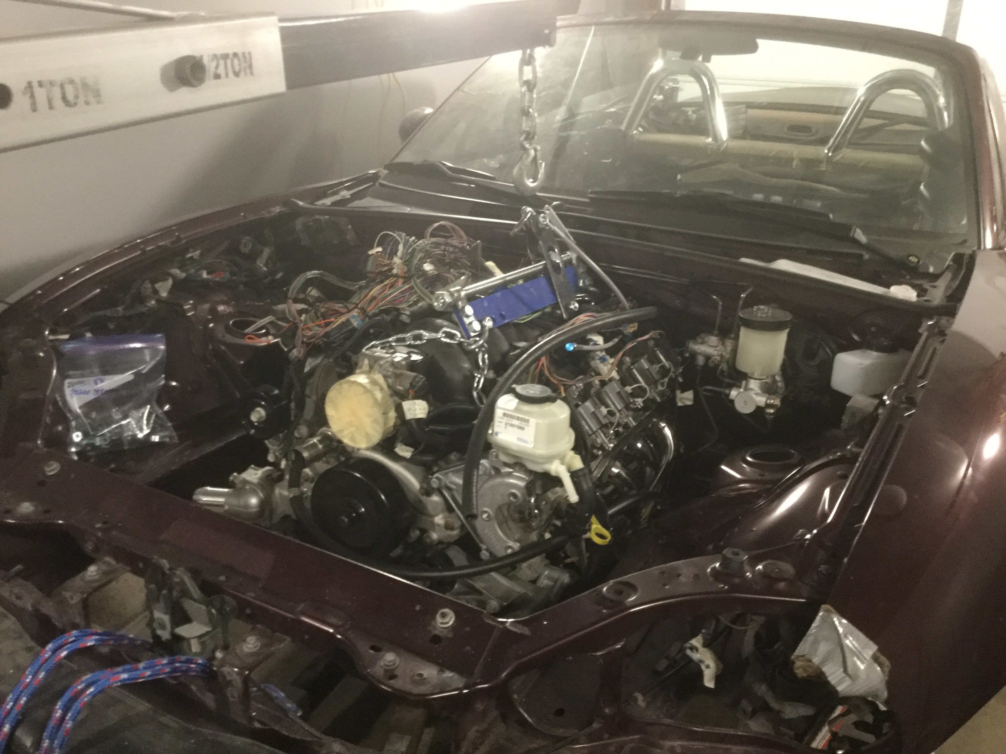 Feels like a really special thing and I was tempted to have a beer to celebrate. Attachment 8524 Attachment 8525 Attachment 8526 Attachment 8527 Will probably have a couple of issues to work thru. One is how to remove the chain and bolts that are tight between the engine and firewall. Guys with a lift do not have these sort of problems but us bootstrap types have it to figure out. My first thought is that I will use blocks to hold the engine in it's present location and raise the body up enough to get to the bolts. Also, still have a number to things to decide. The wiring harness is first. Having the extra long Painless Wiring Harness sure seems like a nice way to go but as I look it sure seems like the LS1 harness will work out decently well. The Painless harness would allow the ECU to mount behind the passenger seat and away from the engine compartment. That will clean up under the hood quite a bit but on the other hand it seems like the Miata main fuse box will have enough connections available to work with the LS1 harness. The Painless harness has it's own fuse box and is new and just what is needed rather than being 17 years old and needing to be modified to work correctly. |