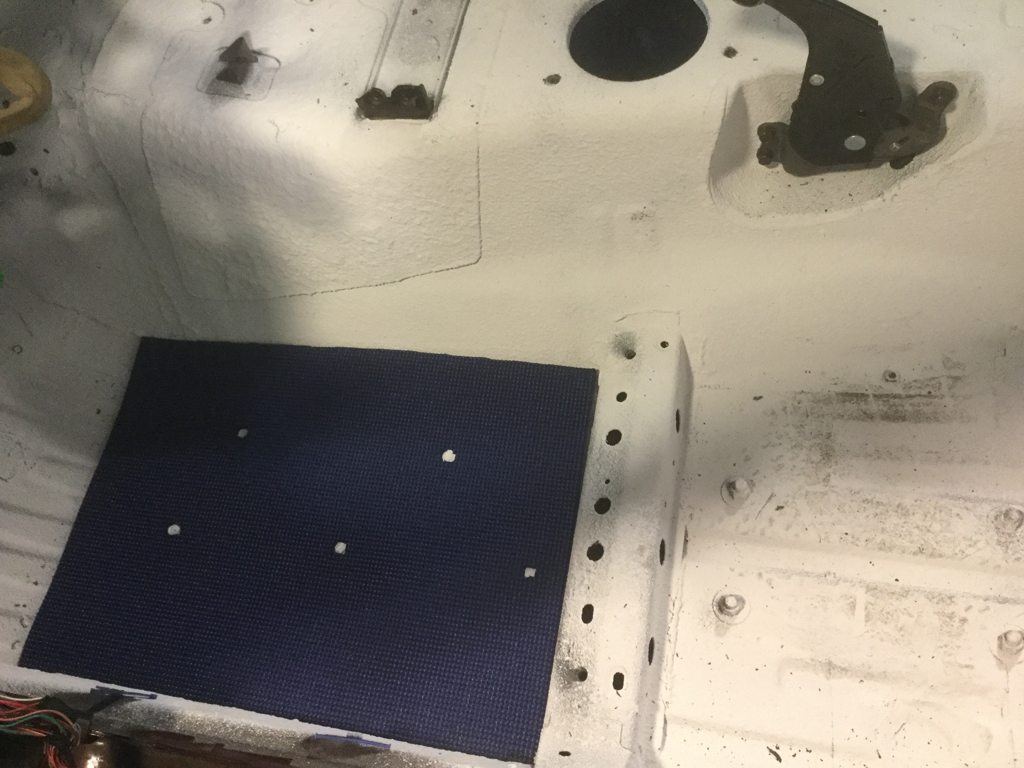 I did put Lizard Skin temperature control spray on the engine side of the firewall then waited for it to dry for a couple of days before painting the engine bay with some factory color match paint. Worked out great and the end product looks real good. You can tell where the Lizard Skin was sprayed because it has a rough texture. In this picture you can also see the frame rails with the stiffener gussets that were welded into the upper inside corners. They looked a bit rough before paint but cleaned up pretty good. It is amazing how much cosmetic roughness paint will hide. Attachment 8530 The Lizard skin noise control product was grey but for some reason the temperature control was white. My guess is it probably comes in other colors but for some reason I did not notice and bought white when placing the order. On the under side of the car I went ahead and sprayed some flat black paint over it but since the passenger compartment will get covered by carpeting I left it white. After a little checking, the temperature control product also does some sound deadening but not as much as the dedicated sound deadening product. In hind sight I would have gotten 1 gallon of each and used the sound control inside the passenger compartment and the temperature control under the car and on the engine side of the firewall. If I ever do another car, it will be one of the things I will know. Back to the interior. The bolts that stick thru the floor that hold the subframe stiffeners to the floor feel like they will be an annoyance to my feet so I decided to put something down. For matting I went to Wal-Mart and got one of the rubberized Yoga mats. The matting got trimmed where the bolts are located (white spots) and after two layers the matting sits flush with the bolt. Should take care of any annoyance to my feet. Attachment 8531 |
