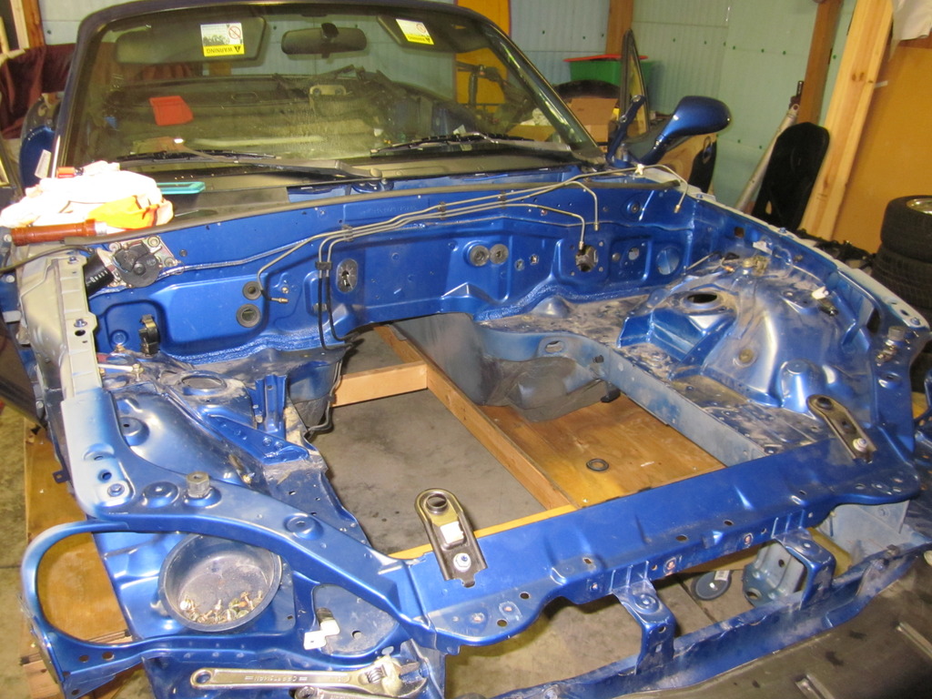 One thing I wanted to point out that I did different than the instructions and what others have said, is I did not cut the interior braces completely out. My interior braces where slightly different from some of yours I have seen before, and I just figured with the way they went all the way up on top of the tunnel, there was no reason to completely remove them. Perhaps it is the difference in NA and NB cars, but I just figured I'd leave them in place until I had to move them. It did take a little more persuasion with the hammer in that area......Notice in the pictures they curl up over the tunnel almost half way across. I ended up just drilling out the spot welds against the firewall and going at it with the hammer.
