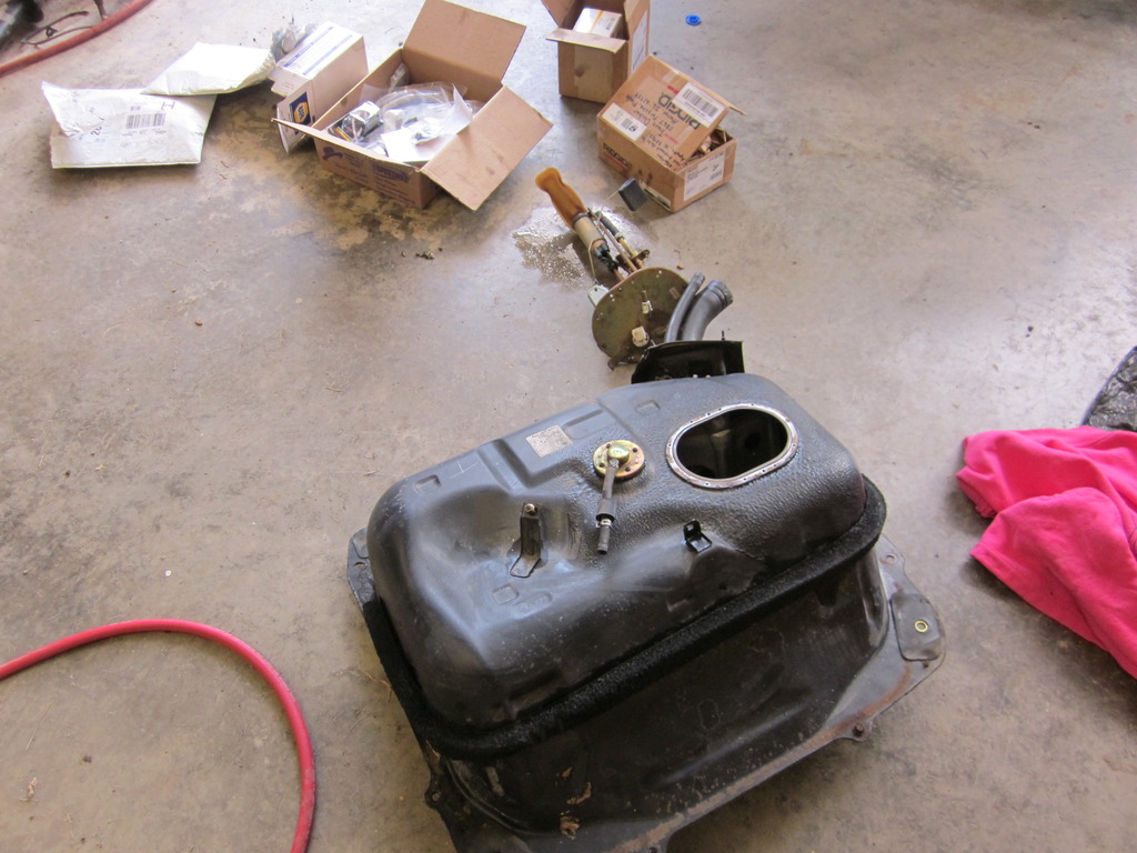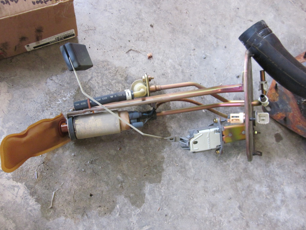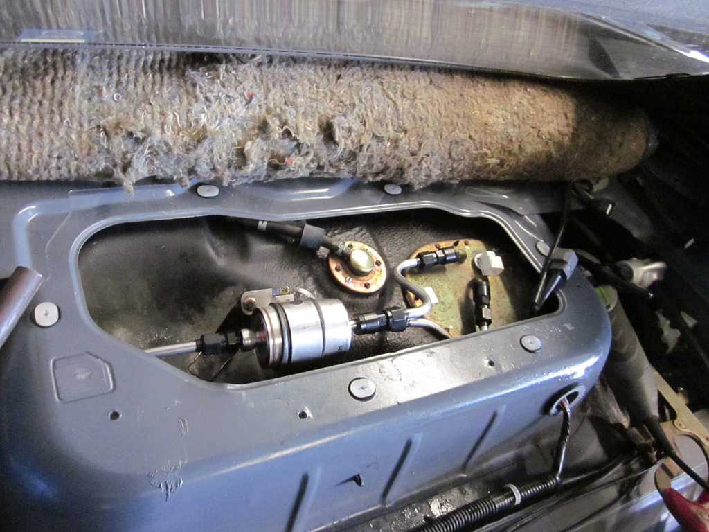 One other thing to note is that the screen that goes on the inlet end of the fuel pump had to be reused. The new one that came with the general install kit I bought did not work. The Miata factory pump mount is angled toward the back of the tank, so the screen needs to be at an angle that counters that to run along the bottom of the tank. No big deal, just a heads up. Here is a picture of the stock setup. I only took about 100 pictures this weekend, but somehow I forgot to take a picture of the new pump in place. It looks basically the same except it has the noise blanket wrapped around it.