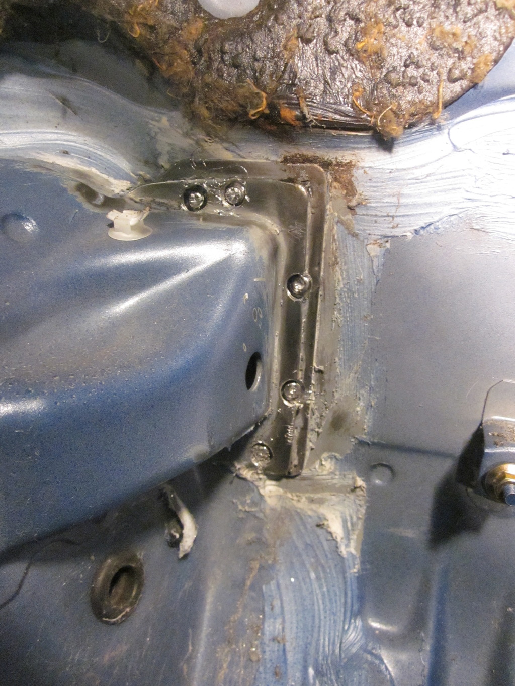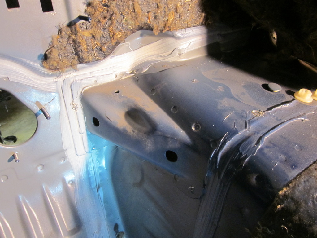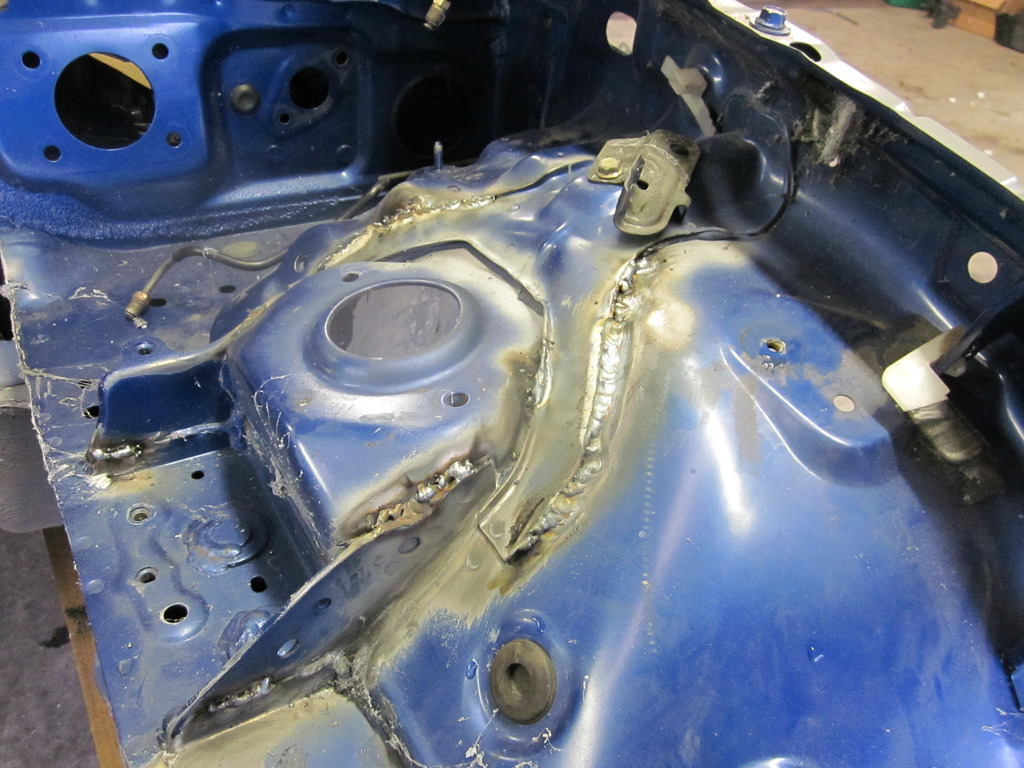 I did a fair amount of blasting, but ended up having to wire wheel it anyways. Seam Sealer makes a MESS! My engine bay looked like I slaughtered a lot spider webs. Here is another shot with a little bit of welding started. Make sure to get everything clean, and I mean CLEAN. The areas of good weld here are areas that I got all seam sealer out, the other areas where the welds look like crap are where I didn't.....