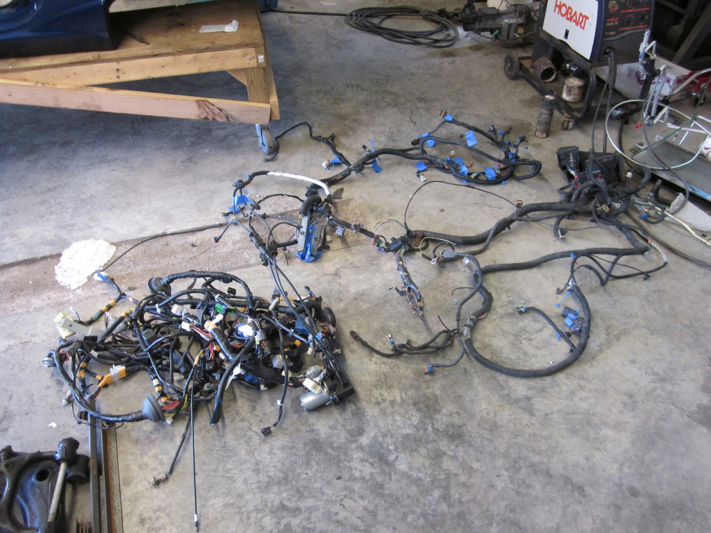 and what a huge scary mess this is! What you see is a well labeled engine harness from the LS1, and non labeled body harness from the Camaro donor car, and the harness from the miata. Before you flame me too much, keep in mind that I did not pull this car apart so labeling it was not an option for me. I do on the other hand have the parts car harness that I have been keeping good tabs on