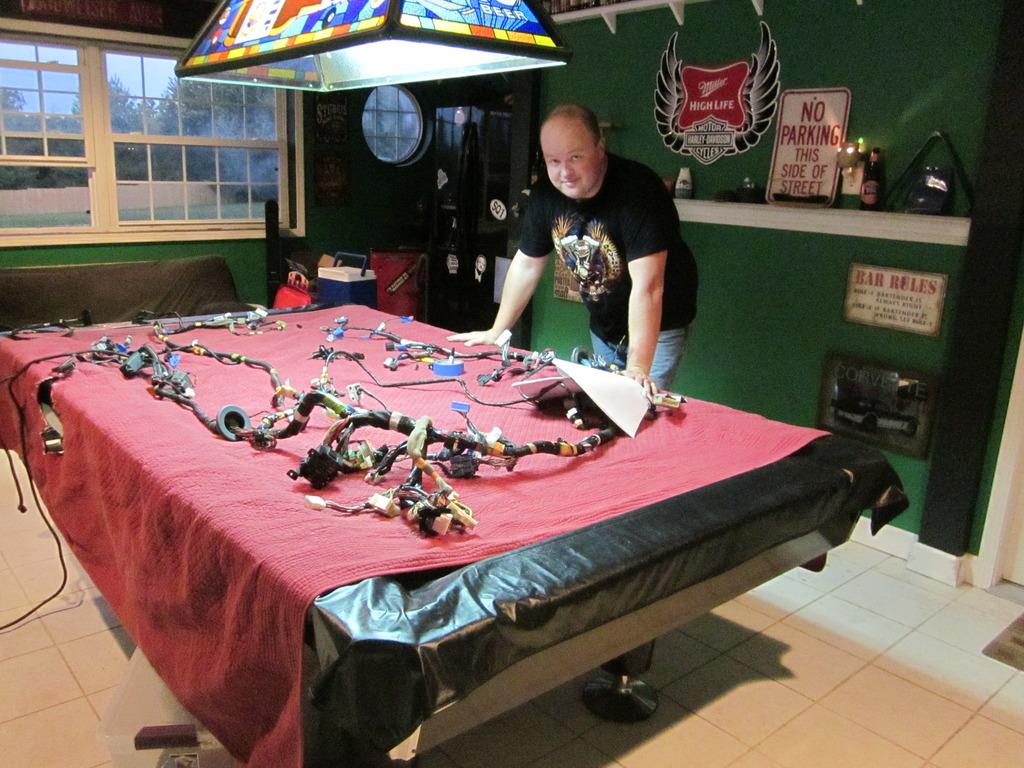 After that I decided I needed to start on something I had been avoiding the whole time....wiring...... My car if you remember came already disassembled a fair amount, so my first probably 8 hours was dedicated to labeling wires with the wiring diagrams. I was able to identify all plugs except for one, but it was on the center leg of the harness that goes over the top of the engine from the factory, so I felt secure enough that it would not be needed and I got rid of it. My wife decided to take a picture of me at work.