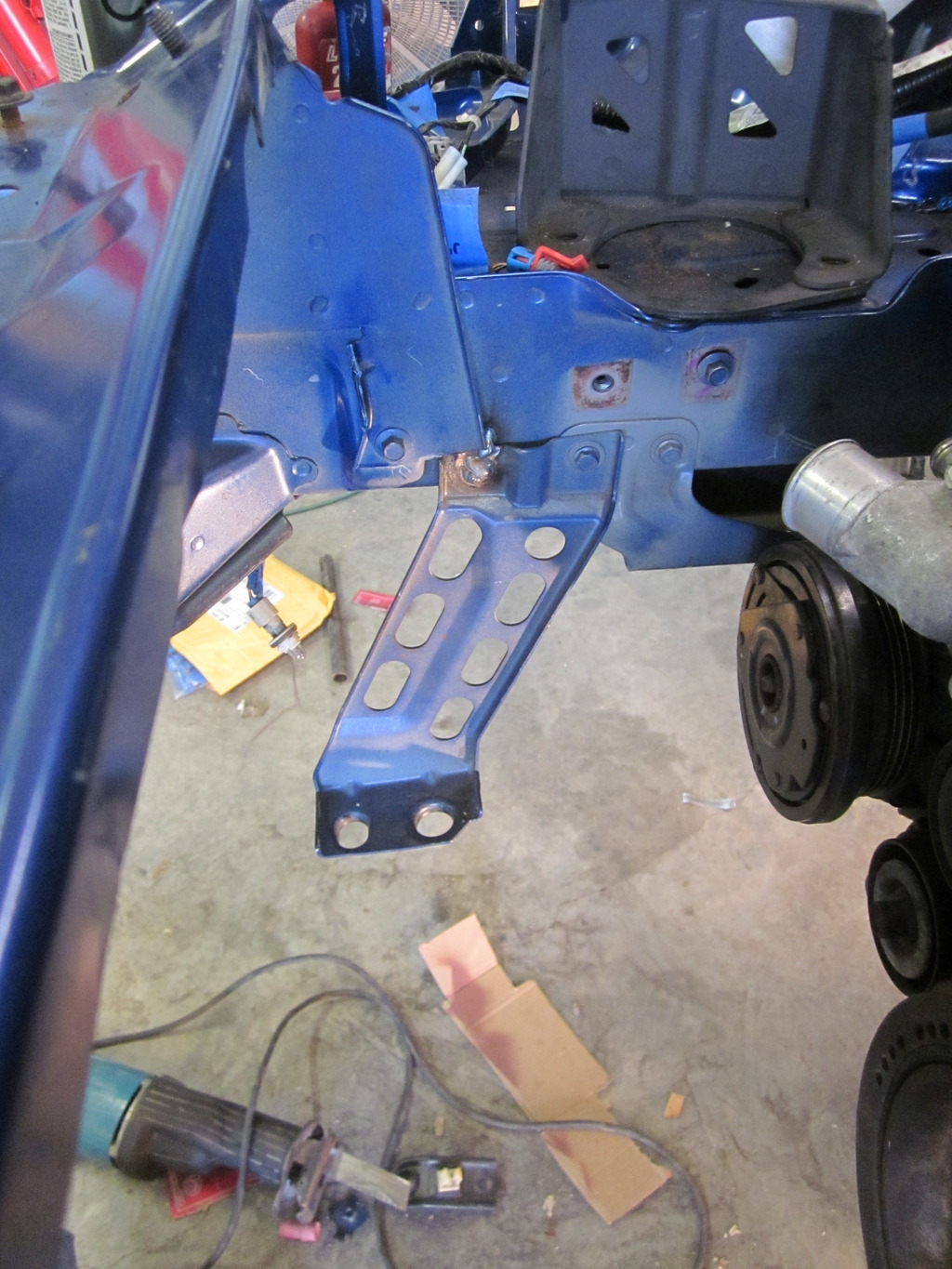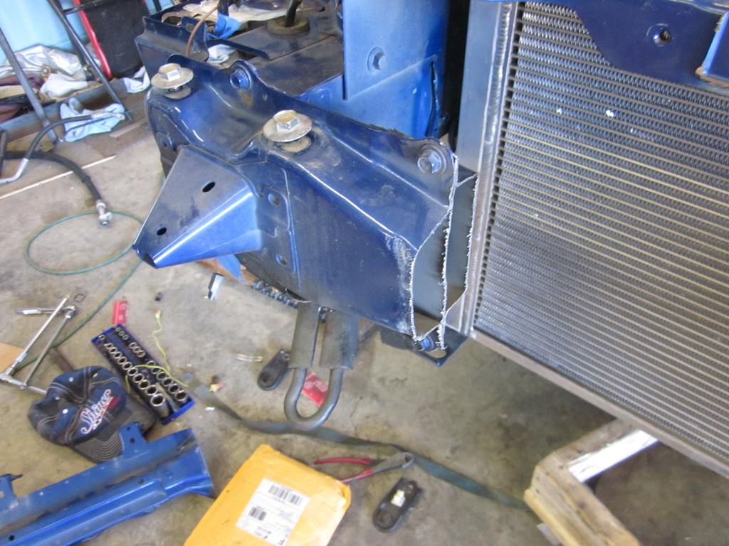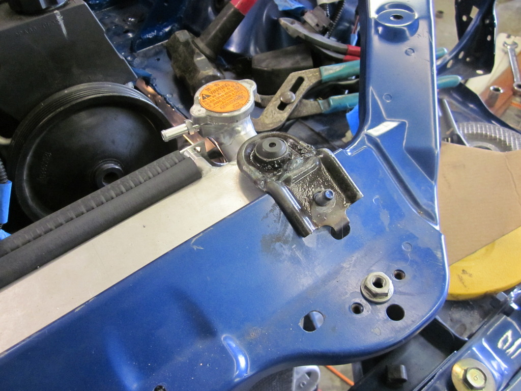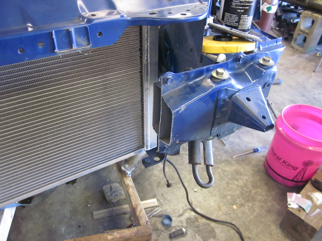 As I said, I things to look at least similar to OEM, I had to modify the upper mounts some since the radiator is now lower. I took the stock mount, beat the curve out of it with my hammer. Then I put it back in place and if you are strong enough(Read that fat) like me, you can fold the mount down around the top of the core support. I then cut it at the correct distance down, removed some its length, and welded it back at the correct spot. Cleaned up and painted. My welds here were less then impressive, but the radiator sure won't go anywhere, and hopefully when I pop my hood they won't be the focal point anyway.