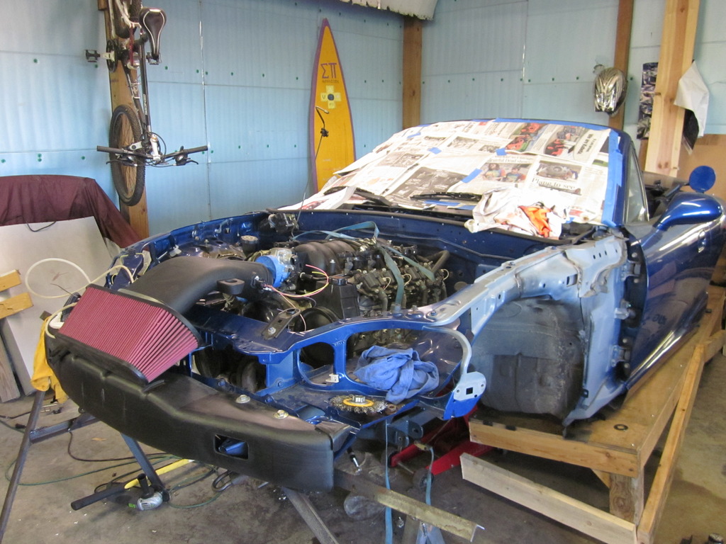 Its hard to tell in this picture, but this is what is left of the factory miata harness after I removed all of the wiring I believe I do not need(Fingers crossed). I kept all the AC stuff, cruise control, and all the stuff required to run the body lights, locks, etc. I decided not to take it completely apart like many of you have done, I instead cut wires at plugs, then pulled them through the length of the harness to a major plug, and un-pinned them there. The factory camaro computer is setting there also, in this picture it had just got back from Brendan at lt1swap.com. I had him do his quick flash to remove VATS, EGR, tune for tire/gear size, 5 wire MAF, etc. Obviously it won't run great with that big cam but this will at least allow me to get it on my trailer to go have it dyno'd.