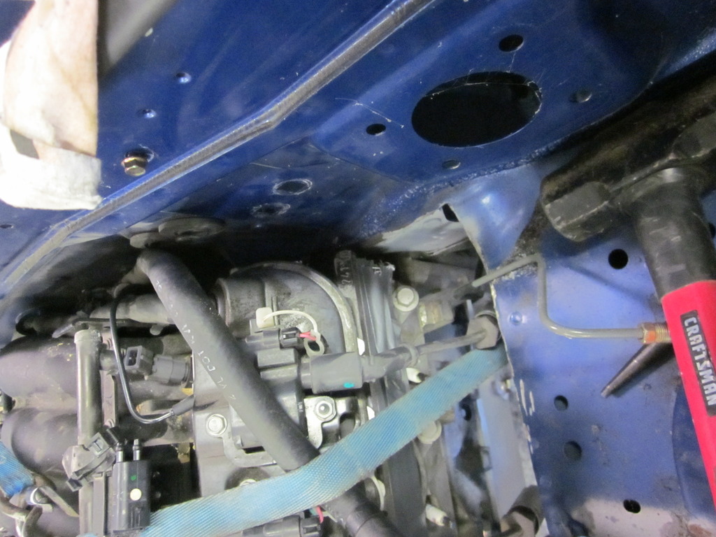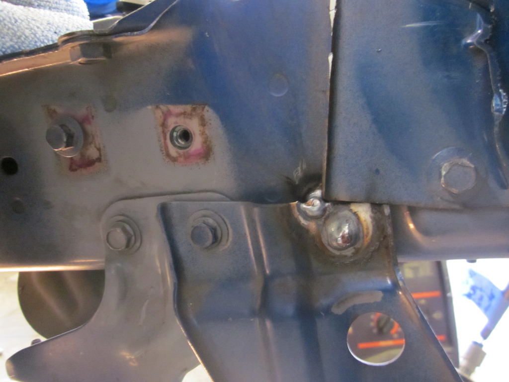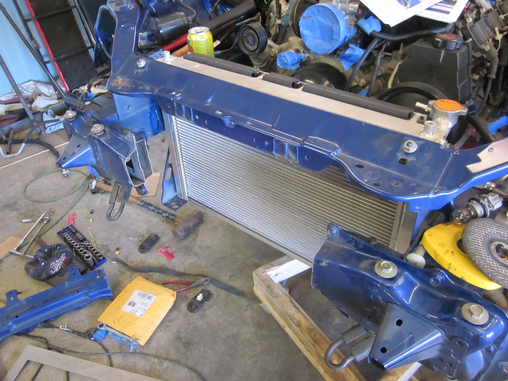 I had my FM radiator all assembled so now I just needed to put in it place. I've seen a lot of pictures of other setups, some lower, some higher, some angled, difference intakes, etc..... I like to make things look as OEM as possible, and obviously if I can I try to make things easier on myself. As you can see in the picture below, I move the radiator bracket down and forward, using the front hole of the sway bar mount to bolt down the rear hold of the radiator mount. I then just cleaned up the front area and welded the hole shut in the front.