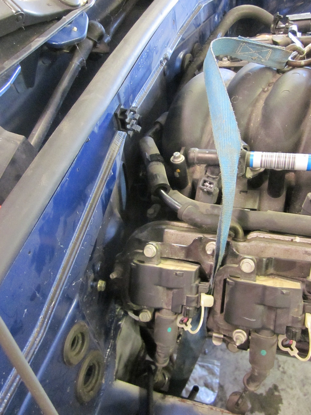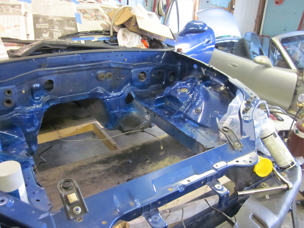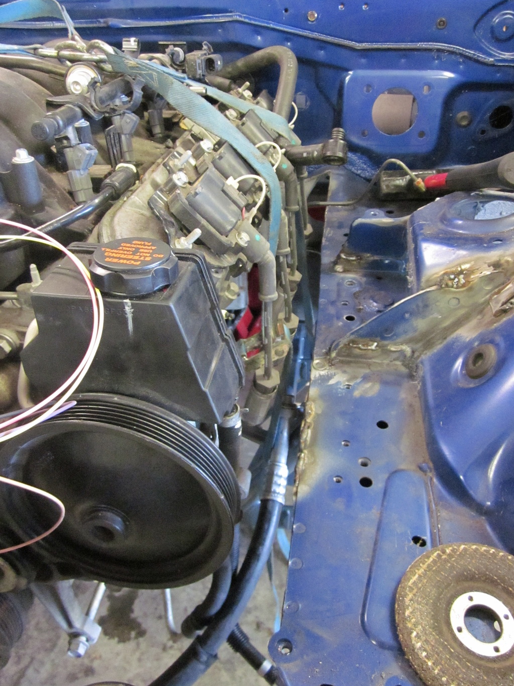 Now that it is all on and dried it was time to paint....I will be undercoating as well but I have not gotten to it yet so don't flame me too bad. I didn't want to change the color of my engine bay, so I went to a local paint shop and had them mix me some paint of my code and put it in an aerosol can(Love the 10AE Blue). It matched really well actually, and it will look even better when I get the rest of the engine bay cleaned up. These pictures don't do it justice with all the dirt in areas I was not working! Worst case scenario I'll just mask and paint the entire engine bay.