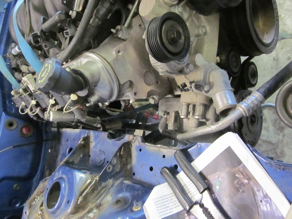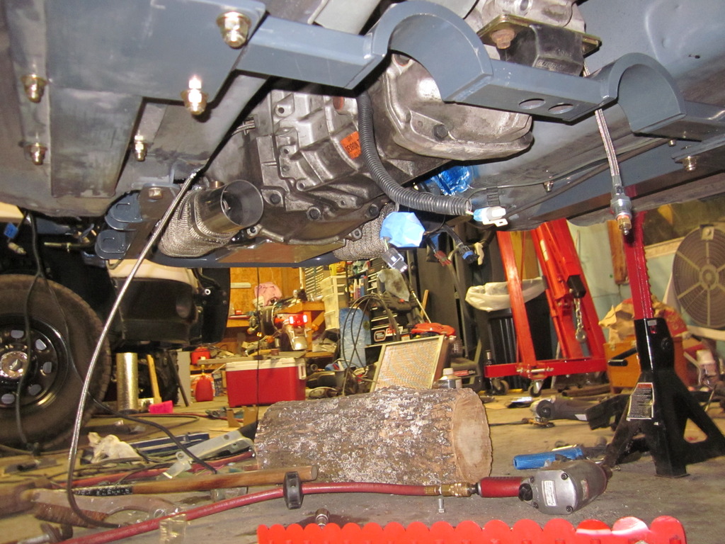 Another learning experience for me here.....When I test fitted the engine/trans, I just used my floor jack to hold the trans up about where I thought it should have been....boy did I make things hard on myself there. When It came down to it, The trans was about 4-5 inches lower when I test fitted it than when I actually mounted it. This may not seem like a big deal, but it was HUGE when It came down to the amount of room I had between the firewall and the back of then engine....Lets just say I did some firewall massaging for no reason......oh well.