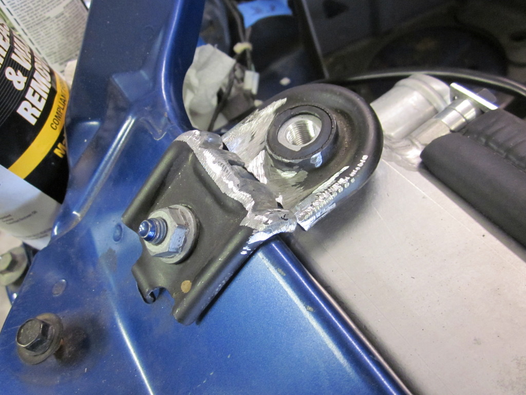 As I said, I things to look at least similar to OEM, I had to modify the upper mounts some since the radiator is now lower. I took the stock mount, beat the curve out of it with my hammer. Then I put it back in place and if you are strong enough(Read that fat) like me, you can fold the mount down around the top of the core support. I then cut it at the correct distance down, removed some its length, and welded it back at the correct spot. Cleaned up and painted. My welds here were less then impressive, but the radiator sure won't go anywhere, and hopefully when I pop my hood they won't be the focal point anyway.