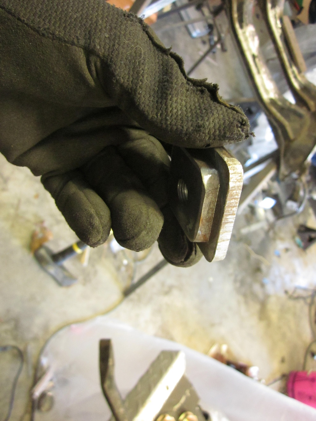 Next I located the holes in the plate. Don't mind the blue hardware, my local farm store coats all hardware in a dye color to identify it, then sells it by the pound. (Blue=Grade 8) Once my holes were in I welded the nuts to the plate on the back side, and ground them near smooth on the sides to fit it some oversized holes.