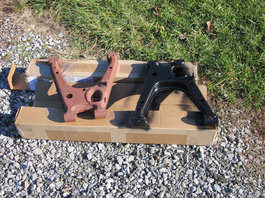 Also got the control arms cleaned up and painted. I used rustoleum heavy rust primer on all this, then I put on duplicolor engine block high heat enamel. I feel like it works great, goes on thick and sets up very tough. And my helper approves.