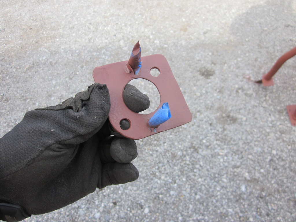 Next I located the holes in the plate. Don't mind the blue hardware, my local farm store coats all hardware in a dye color to identify it, then sells it by the pound. (Blue=Grade 8) Once my holes were in I welded the nuts to the plate on the back side, and ground them near smooth on the sides to fit it some oversized holes.
