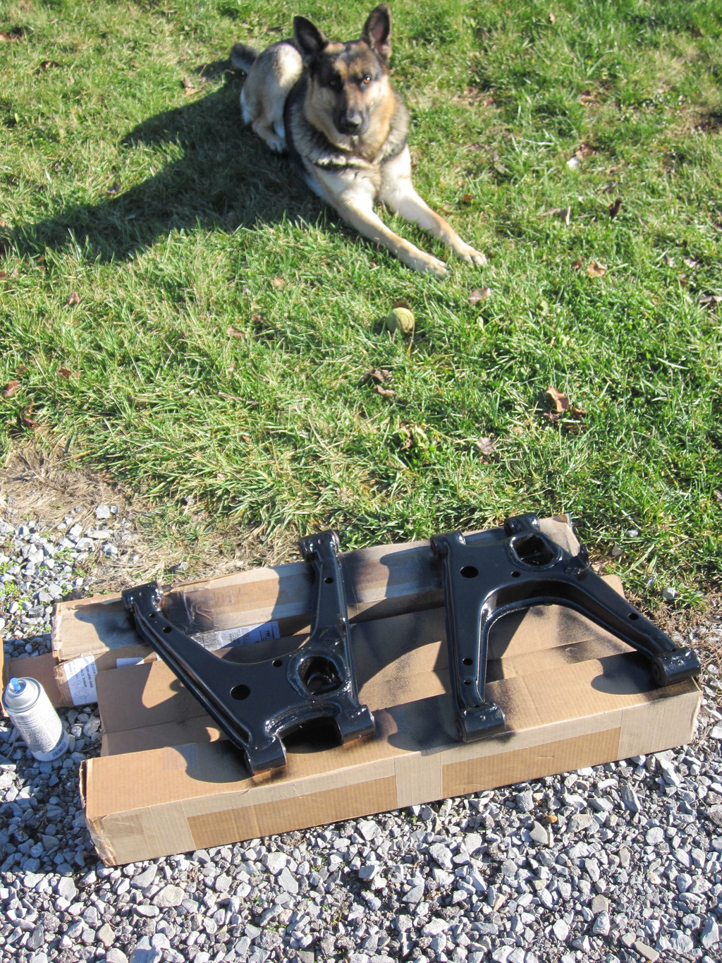 Also got the control arms cleaned up and painted. I used rustoleum heavy rust primer on all this, then I put on duplicolor engine block high heat enamel. I feel like it works great, goes on thick and sets up very tough. And my helper approves.
