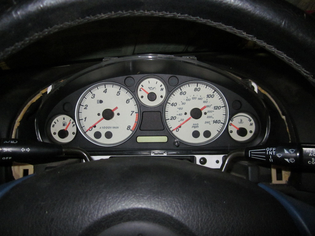 At first I was planning on using the standard gauges that came with the car, and I was looking for a cluster that had similar miles on it to my engine. I really just didn't want to use a white face cluster because they are orange when they are lit up, and I knew that my radio/HVAC stuff was green. Not a big deal, but I have a decent eye for detail and it would have bothered me. Well in reading about the clusters a bit, I figured out that the light for the gauges is provided by bulbs with a colored sleeve over them. Great news for me, because I picked up a white cluster from an 03, with 20k miles on it(close to my engines 17k), and I switched all the bulbs with one of my other clusters. I haven't had it turned on yet, but it should match just fine now with my radio.