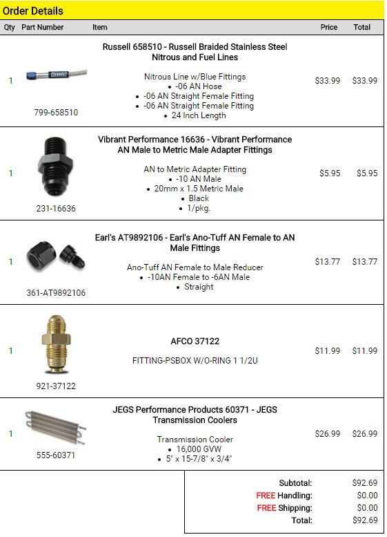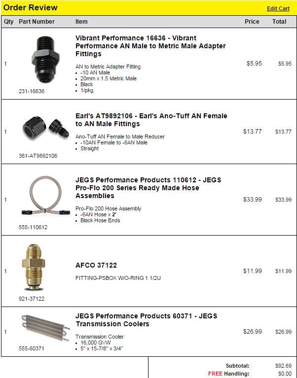 As I have done with a few other systems, I am going to put this all here for people who come behind me and want to add power steering for less than the kit price. FM Price=$160+shipping, my total price is $92.69 shipped, and thats with a brand new universal cooler, that is not included with FM's kit. The only thing I don't have here is a crush washer for the 20x1.5mm fitting, but I didn't put that on here because I have those laying around! The one thing the FM kit will be nice for is that they have the 20x1.5mm to -6an fitting, I could only find one in Australia, so I had to buy a bigger AN size, and reduce it down.