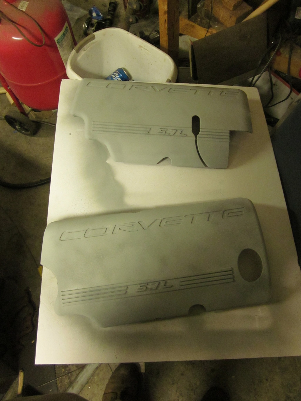 Also in the background of the other work going on here, I have been working on my fuel rail covers, they are not completely done yet, but they are coming around very nicely if I do say so myself. My process was rough them up with a SOS pad, medium grit. I didn't really have to have them be glass smooth, so I just did this grit. Since they were already mostly black, I taped off what I wanted to stay black as shown in a previous update. From there I sprayed them with Duplicolor adhesion promoter, which acts as a primer, and a binding agent to help the paint stick better to plastic parts. I also hit them with a basic automotive primer, because I was worried the color would show bad over the black/flowers that were there before. Here they are in primer.