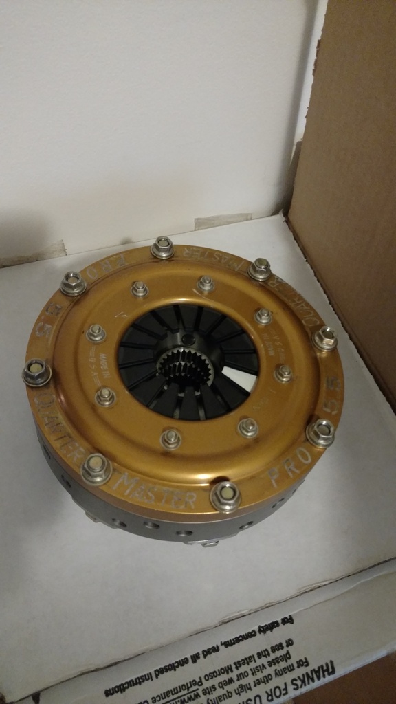 This may be quite over board, but we'll see. I picked up a Quartermaster Pro 5.5 triple disc clutch for pretty cheap! This thing is crazy light, 13.5 lbs including clutch and flywheel but not including the auto flex plate it bolts to. It's brand new and I have a rebuild kit for it. It is a metallic clutch, so that will be interesting, but it sounds like I have a connection to get organic discs for it if need be. I certainly don't need the 900 ft-lb rating of the clutch, I'm more so interested in the low moment of inertia. I chose the triple disc solely to have more distributed heat capacity, which is my main concern of driving a 5.5" clutch on the street.