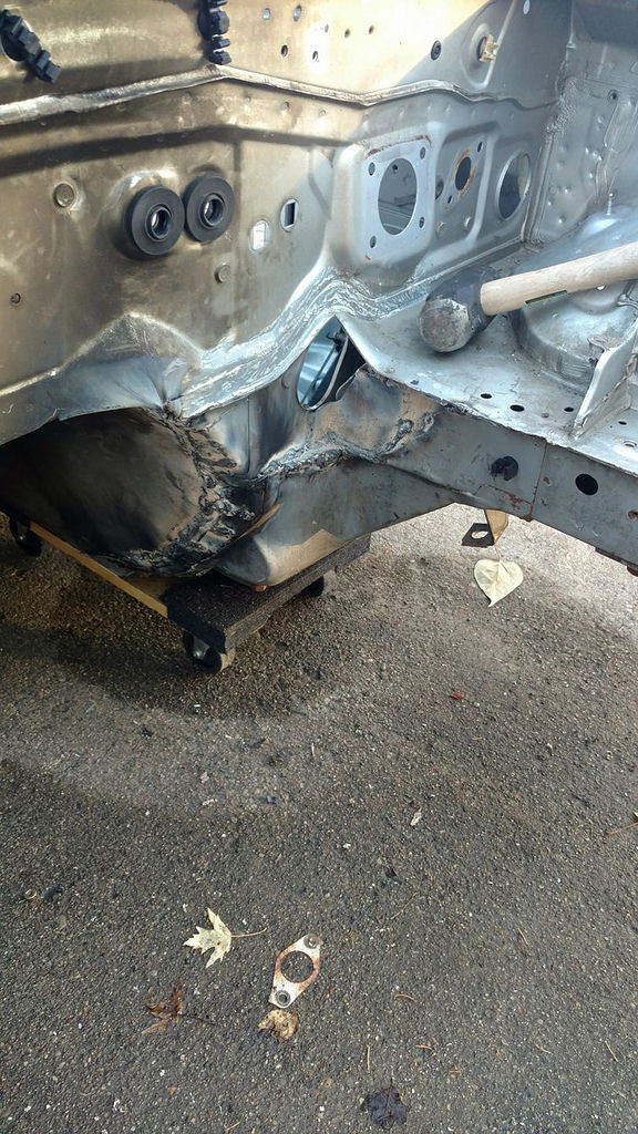 I pulled the motor out, got it out of the garage to pressure wash the engine bay, and weld up the transmission tunnel. Hopefully I'll get around to seam sealing the bay tomorrow so I can prepare for paint.