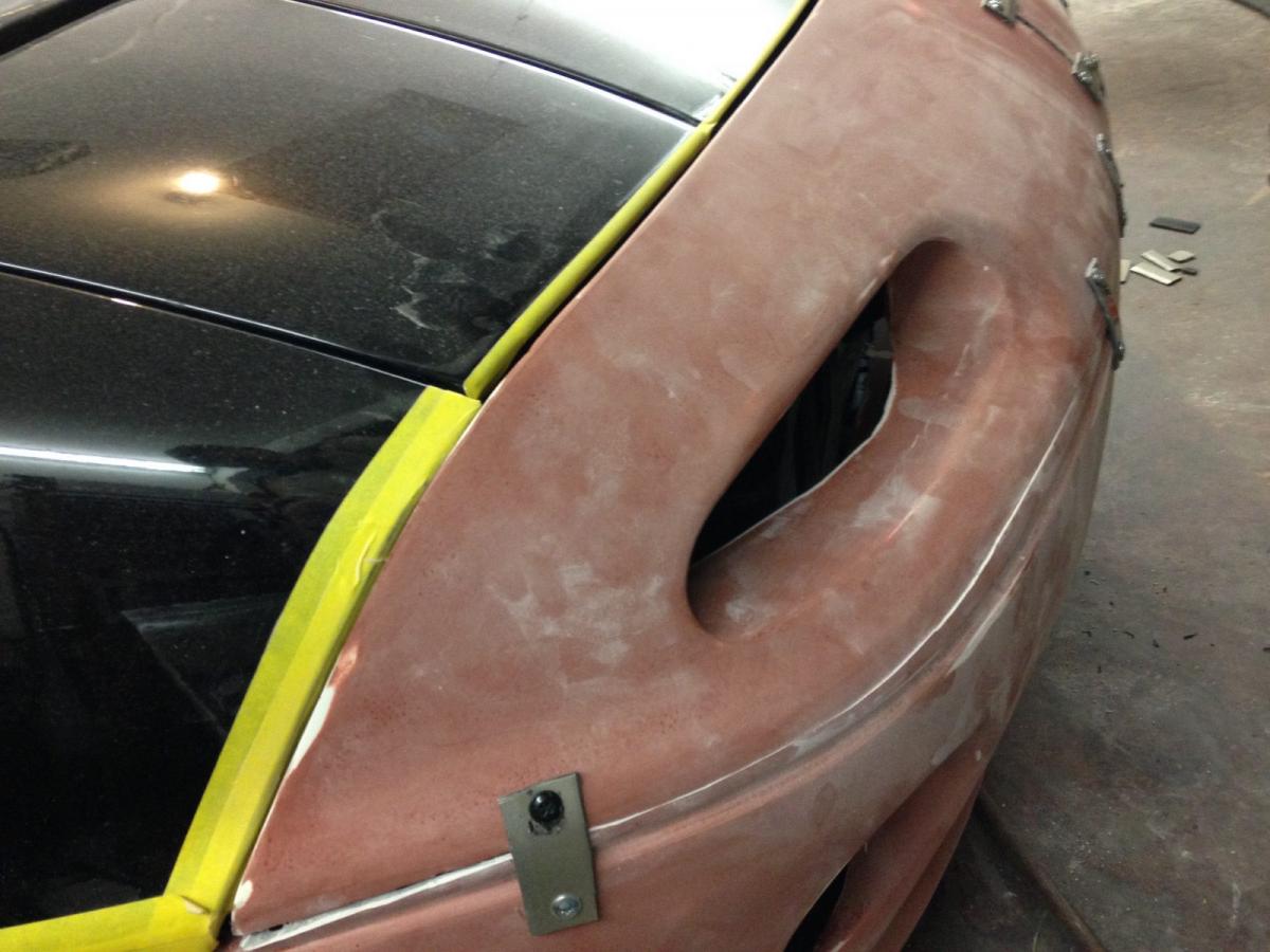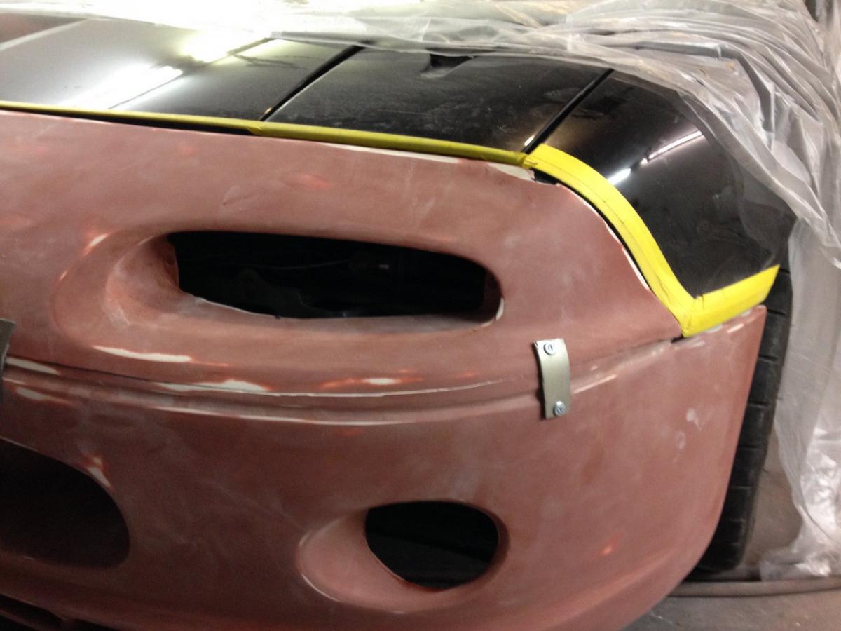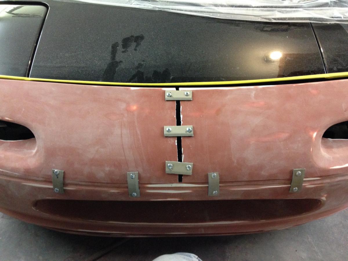 Got some pics of the Frankenstein work being done on the POS Autokonexion front bumper. I really like that fast back hardtop they make but it the quality and fit is as bad as this bumper I'll not waste the money. You can see in the pics how much the Marks had to widen the top part for a non stressed fit and then they are having to make up about a .5 inch of hood gap.