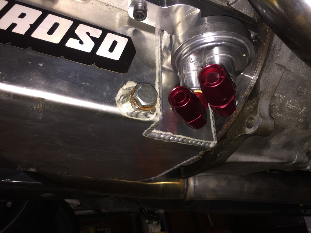 Adapter added to Moroso oil pan with 90 degree AN swivel adapters: