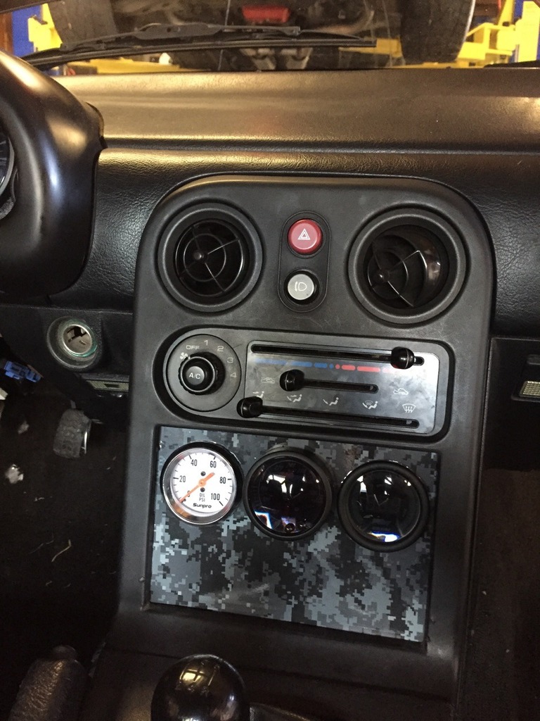 Got the car wrapped. Went with just the sides and top with black digital camo. I plan on adding a subdued black stripe with stars cut out over the hood and trunk. Also completed the gauges with same vinyl wrap. The gauges are a wet oil PSI, Oil temp, and digital air/fuel. Oil psi is white because I used it from another project to save $$.