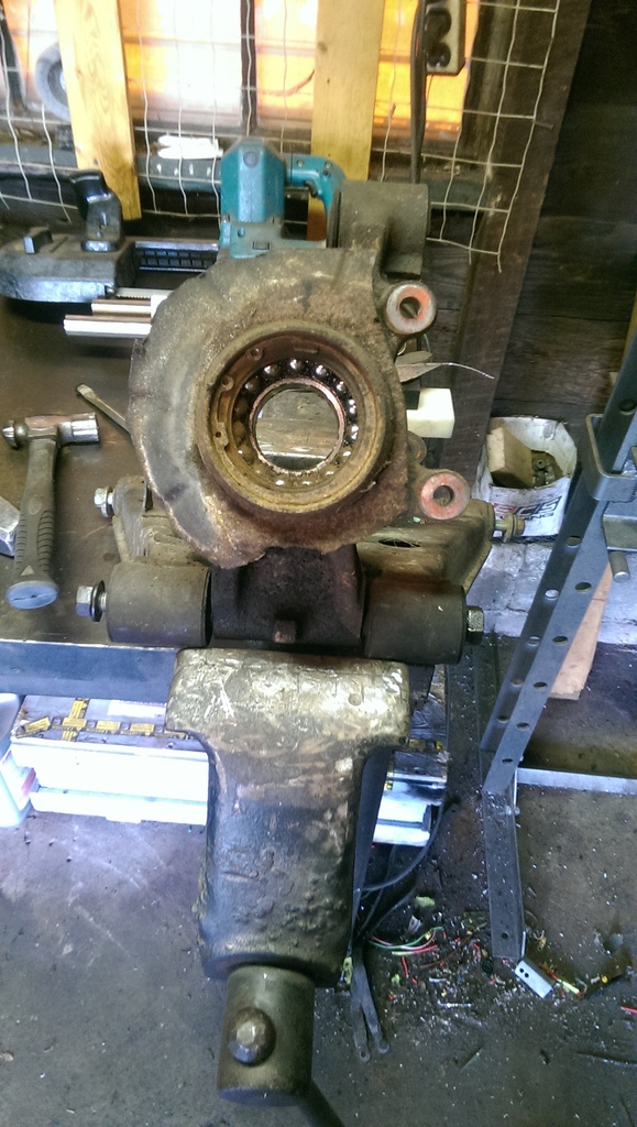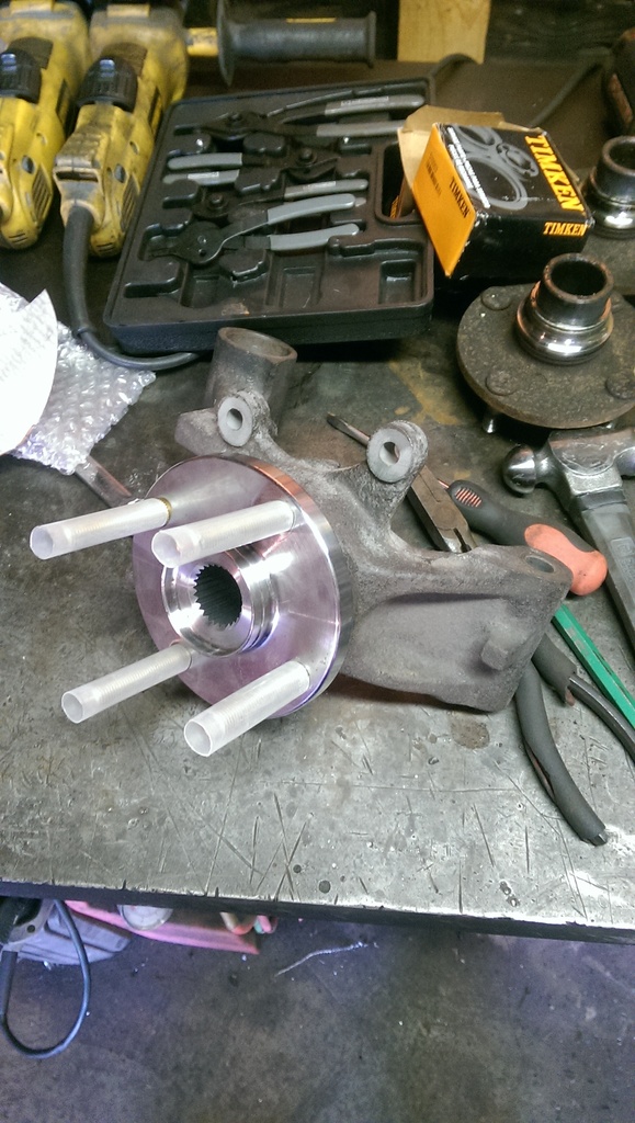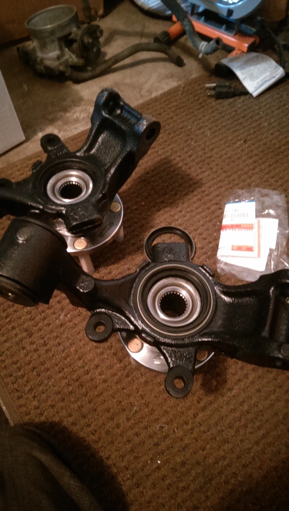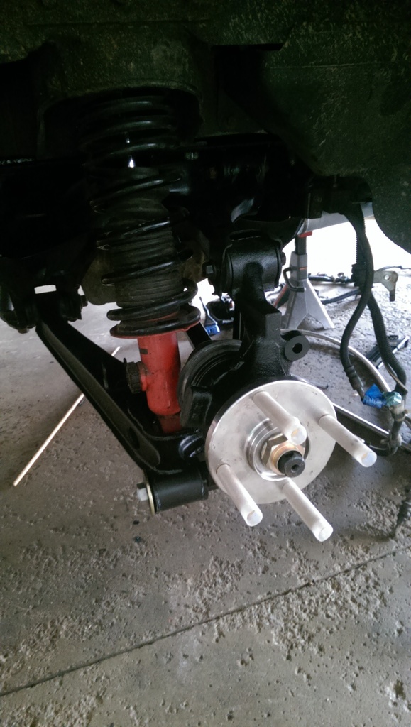 Next I installed new wheel bearings, and hubs into the rear knuckles. Bent both rear lower control arm bolts. That sucked. Those are expensive bastards at ~$17 a piece!!