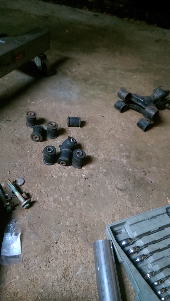 My paint booth! finished up painting all the control arms, and pressing in the new poly bushings.