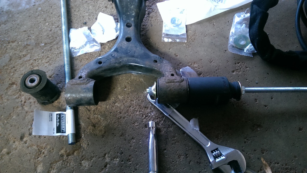 I wasnt going to do poly bushings at this time. But since I started to melt the lower rears when trying to get the knuckle off, I kind of have to . So the ole allthread and washer technique.