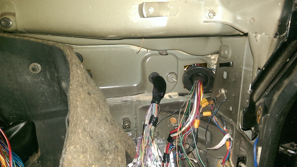 So I pulled it all back through to the engine bay, and spotted a hole in the firewall Just to the left of this stud. ( see pic ). Chocked up my stepped bit, and opened it up to about 3/4". and pulled the ECU wires through there with a grommet.