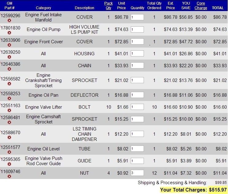 As everyone has said, its the little things that can eat you up. Here is why getting a bare block sucks. I'm likely going to buy all this new vs dumpster diving at the Junkyard. I doubt we have much for Gen IV engines available anyway. I managed to throw another 100 or so on there in gaskets, crank bolt, etc. Btw, I can't believe the crank bolt is like 4 dollars. 5.95 for an LS7 version. No excuse not to replace it every time. I even bought two just in case.