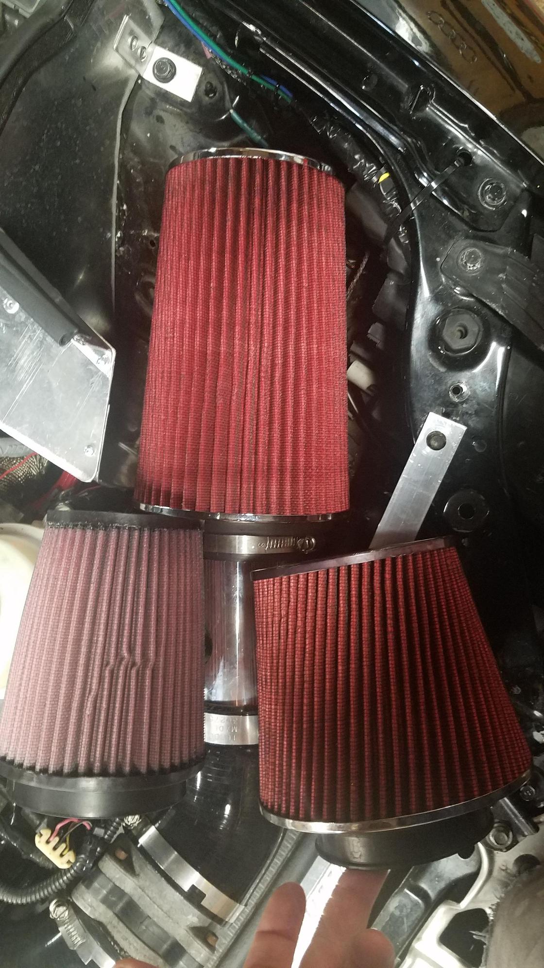 Made a minor upgrade to the air intake system. The original air filter was something I bought on the cheap along some of the air intake tubing and couplers, and it was sufficiently sized, but was not an oiled filter like a K&N. An oil analysis I did pointed to high levels of Silicon in the oil, which is usually b/c of dirty air getting into the combustion process. Blackstone Labs, which did the oil analysis, recommended checking the air filter and intake system. Since I don't think I have any leaks, I decided to upgrade to a K&N filter. Unfortunately I bought it while on vacation, and realized it seemed too small for my application. So then I upgraded to what I think is one of the largest conical K&N filters they make. It's probably way too big, but it fits and may come in handy as I plan future power upgrades.