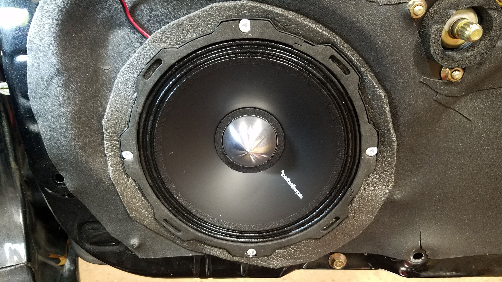 The 8" door speaker dropped right in after removing the old Fosgate coax speakers and pods (For sale, if interested).