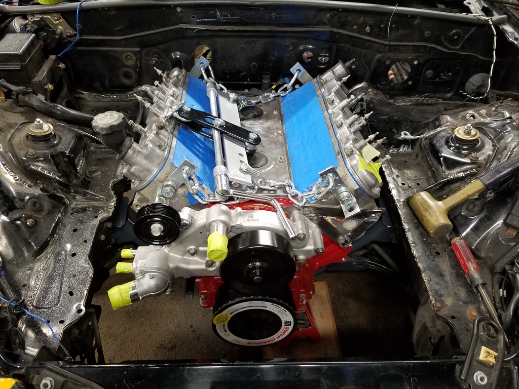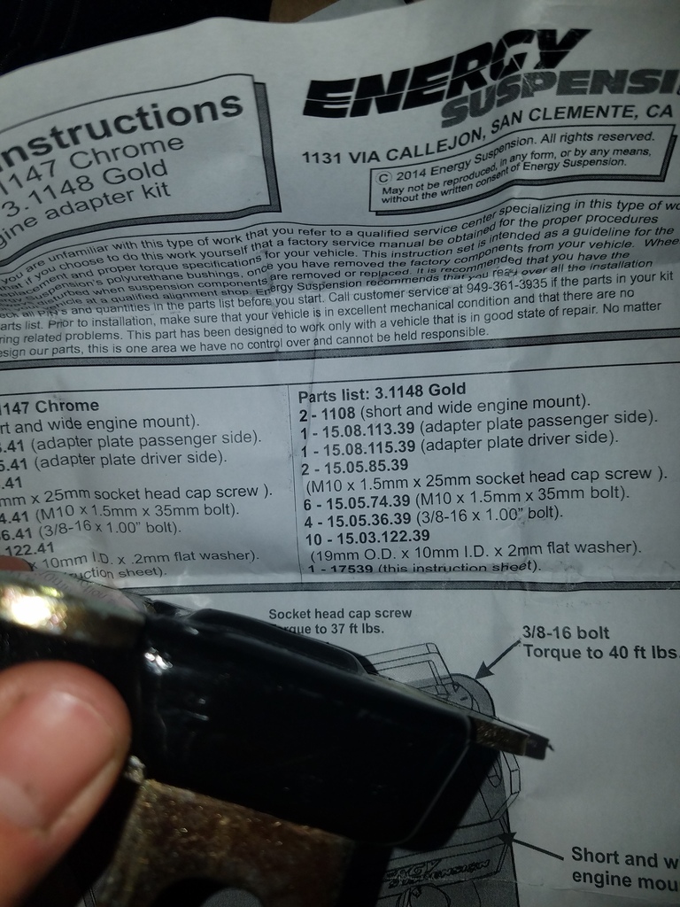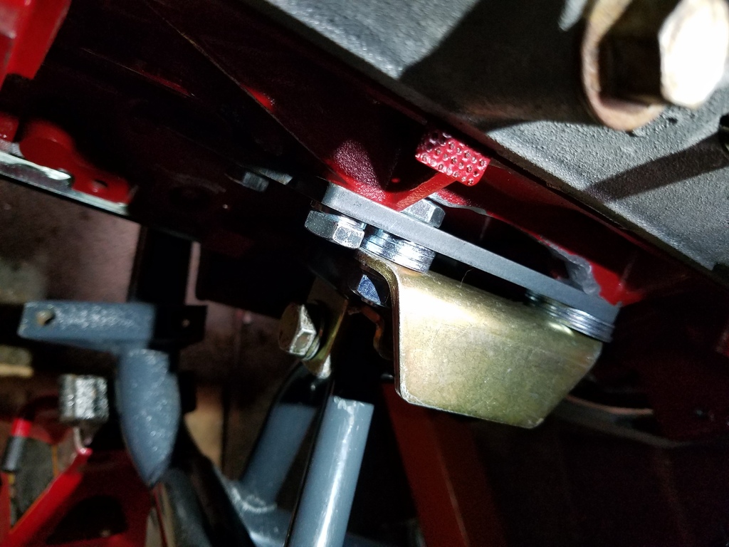 So what's going on here? Not sure.. I did some research on different motor mounts for the LS, and it seems I have what others are using - Energy Suspension brand. The steel plates that bolt to the engine block seem to be sorta DIY - not sure if they are the FM or V8R pieces. I lifted the engine up, removed everything, flipped the mounting plates over, installed the motor mounts the correct way and installed some washers as spacers until I had the right spacing. I ended up with 3 washers on each side of the engine and the alignment was spot on.